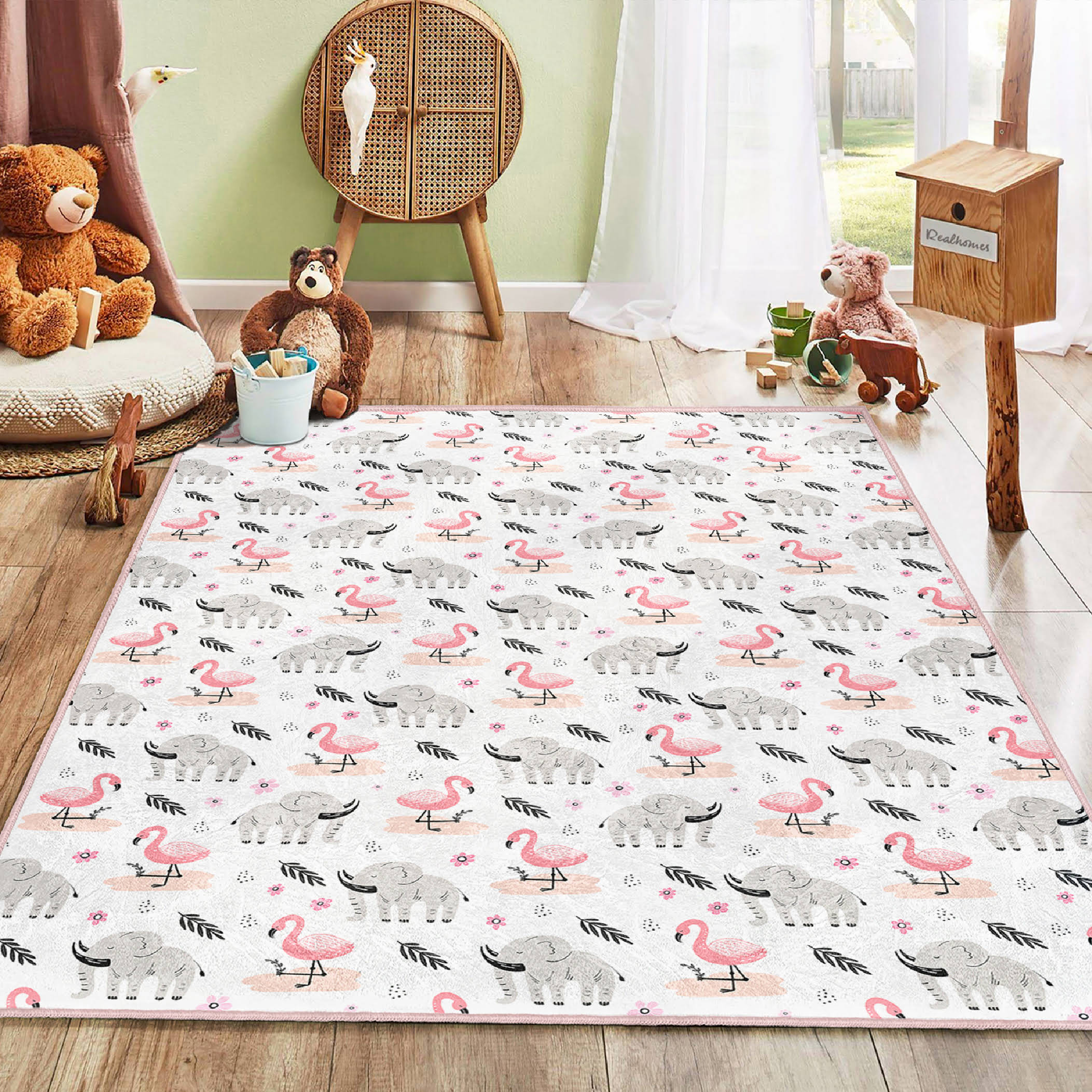 Flamingo Ve Fil Motifli Çocuk & Genç Odası Makinede Yıkanabilir Kaymaz Tabanlı Dekoratif Dikdörtgen Pamuk Tabanlı Çocuk Halısı