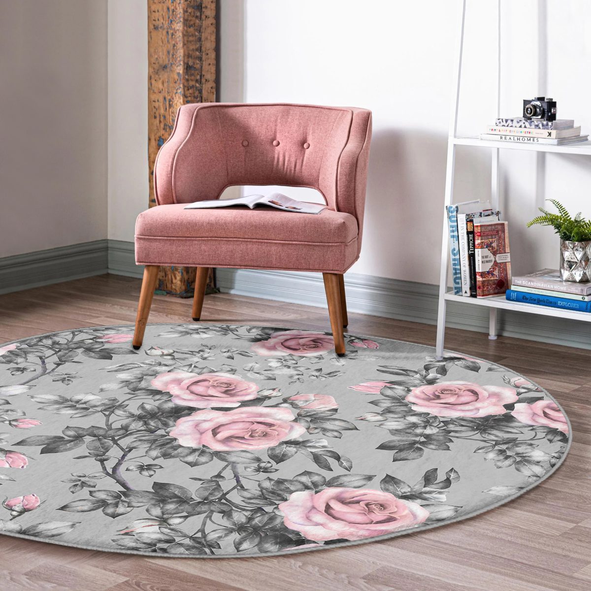 Füme Temalı Kanaviçe Çiçek Motifli Dijital Baskılı Gri Mutfak Yıkanabilir Kaymaz Tabanlı Yuvarlak Halı