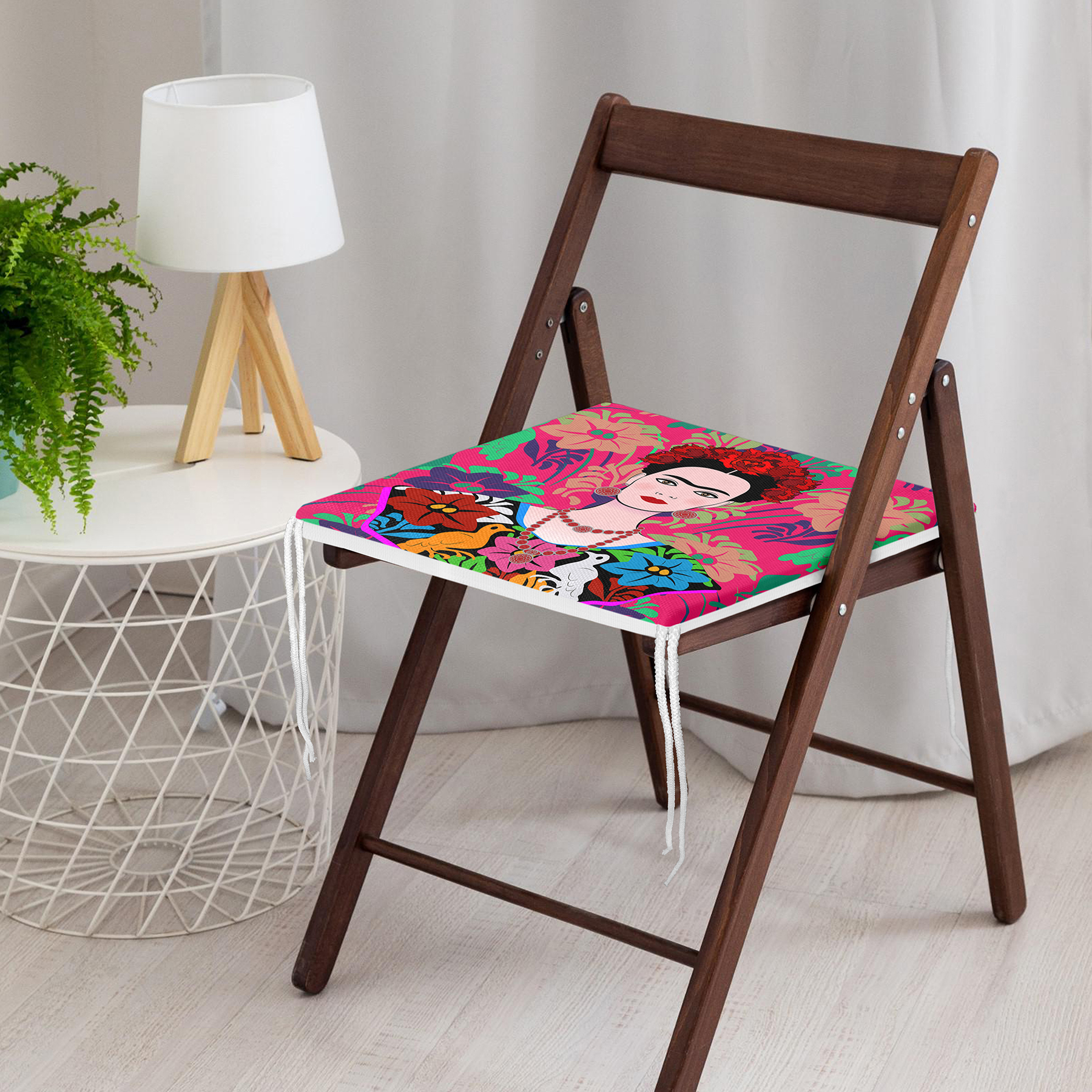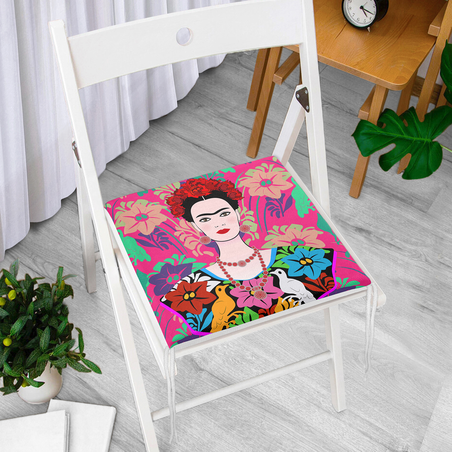 Fuşya Zeminde Frida Kahlo Motifli Özel Tasarım Fermuarlı Sandalye Minderi Realhomes