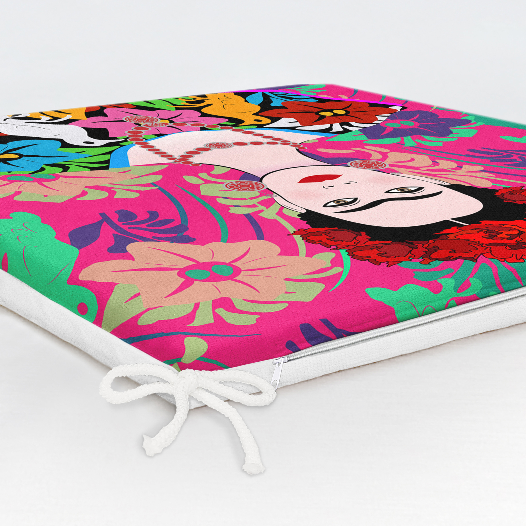 Fuşya Zeminde Frida Kahlo Motifli Özel Tasarım Fermuarlı Sandalye Minderi