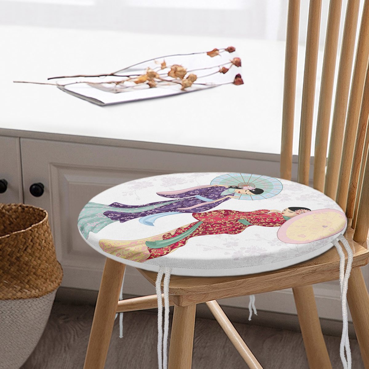 Geleneksel Kıyafetli Japon Kadın Figürü Dijital Baskılı Özel Tasarım Modern Yuvarlak Fermuarlı Sandalye Minderi Realhomes