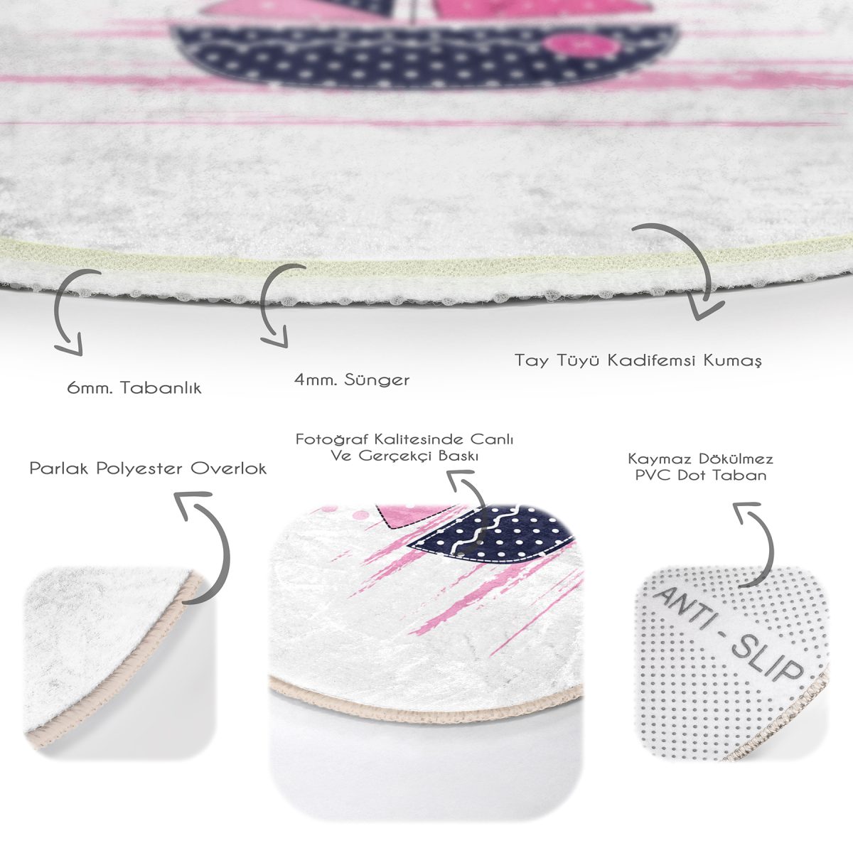 Tabanlık ve Dolgu: 10 mm Kaymaz dokuma tabanlıdır.