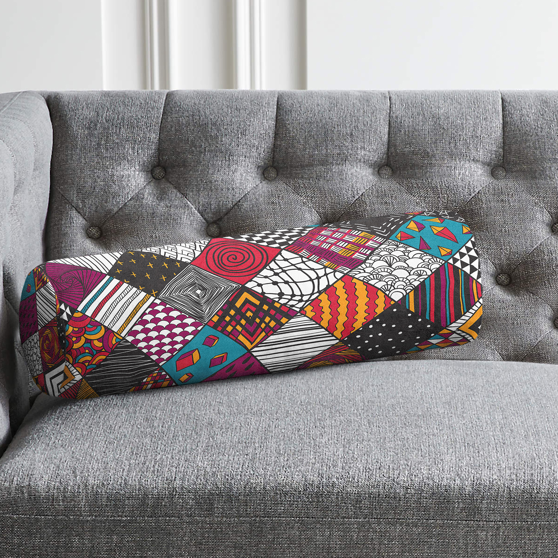 Geometrik Çizimli Kare Tasarımlı Dijital Baskılı İç Dolgulu Süet Silindir Yastık Kırlent – Bel Yastığı