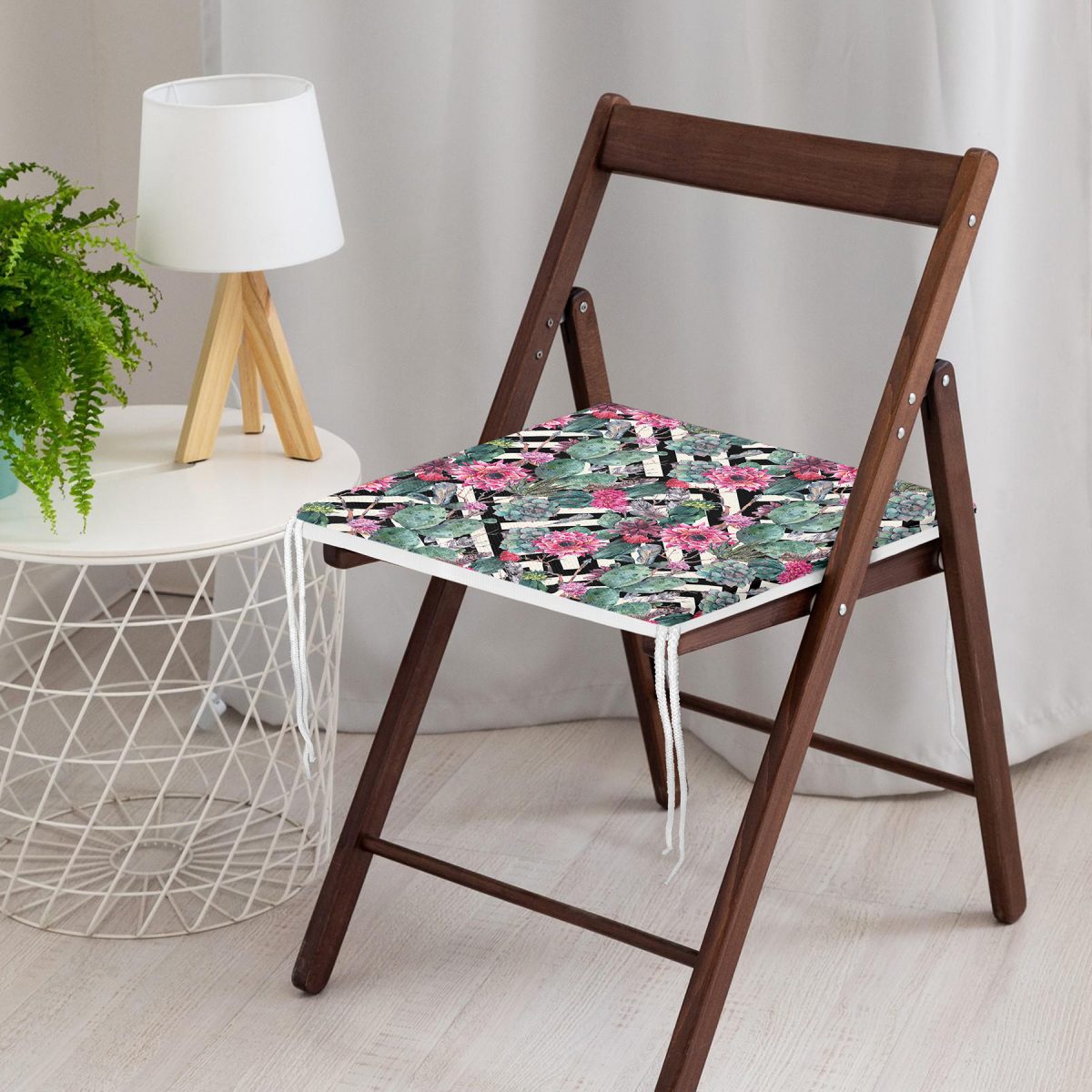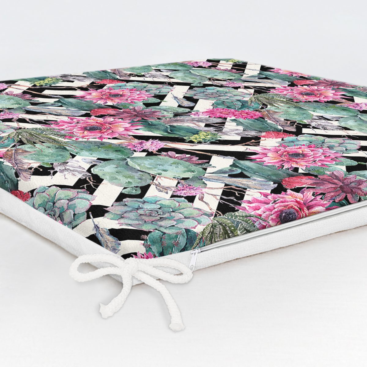 Geometrik Zeminde Çiçek ve Kaktüsler Özel Tasarım Fermuarlı Sandalye Minderi