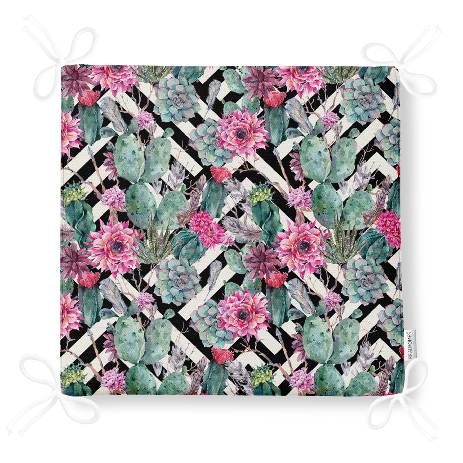 Geometrik Zeminde Çiçek ve Kaktüsler Özel Tasarım Fermuarlı Sandalye Minderi Realhomes