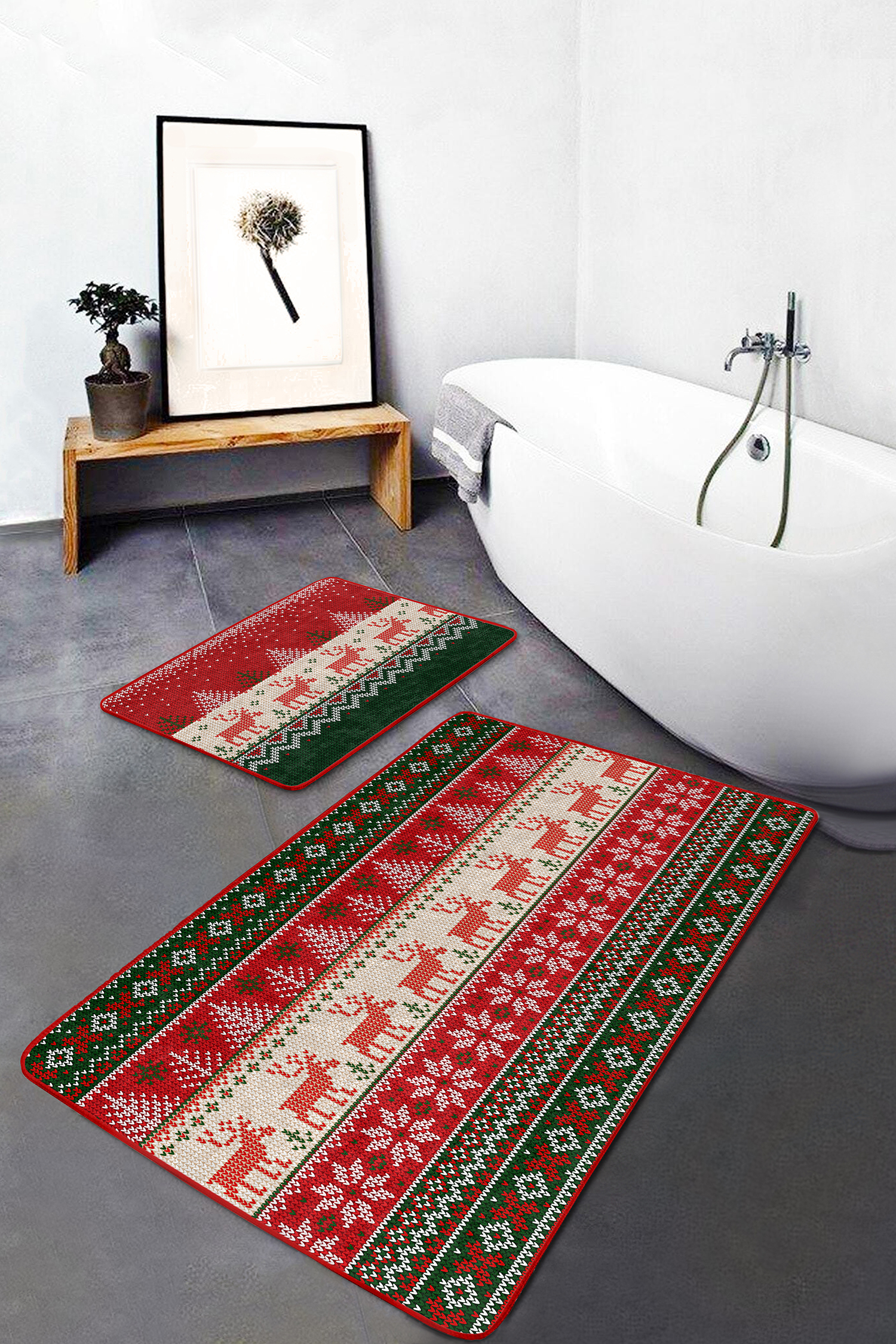 Geyik Motifli Yılbaşı Temalı Dijital Baskılı 2'li Kaymaz Tabanlı Banyo & Mutfak Paspas Takımı Realhomes