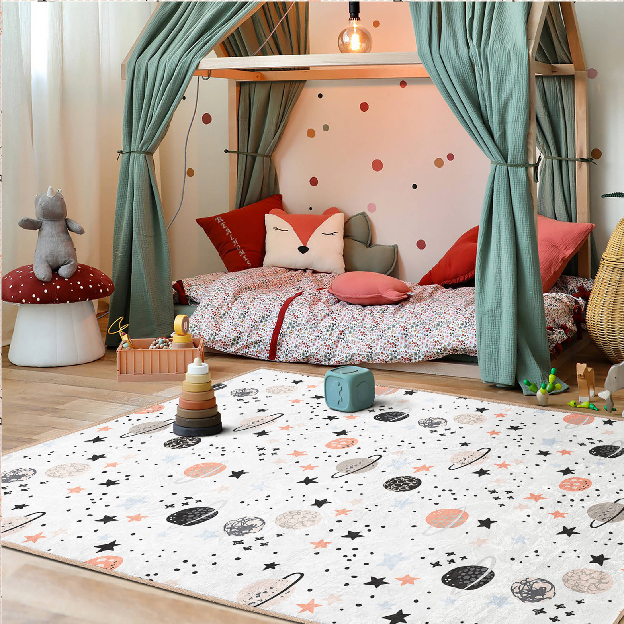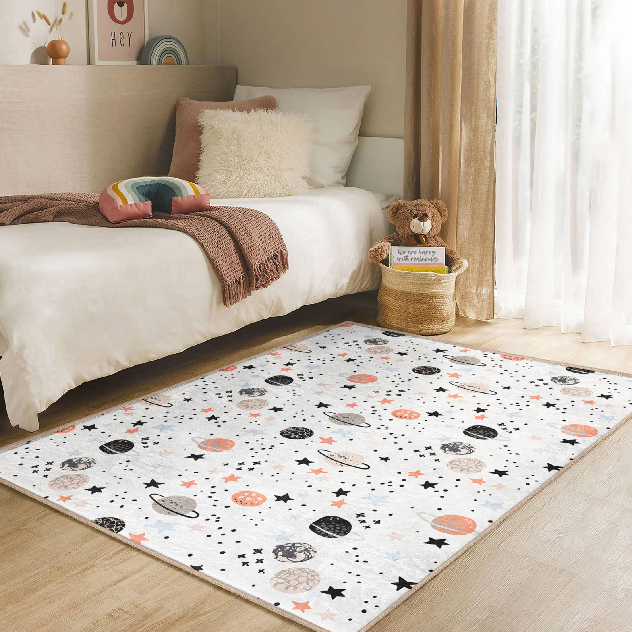 Gezegen Desenli Çocuk & Genç Odası Makinede Yıkanabilir Kaymaz Tabanlı Dekoratif Pamuk Tabanlı Dikdörtgen Özel Ölçü Çocuk Odası Halısı