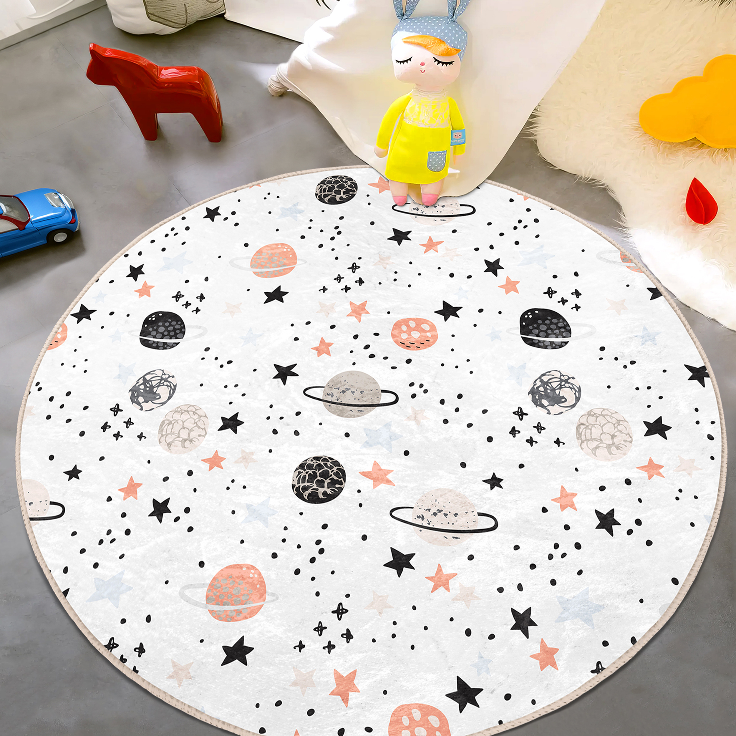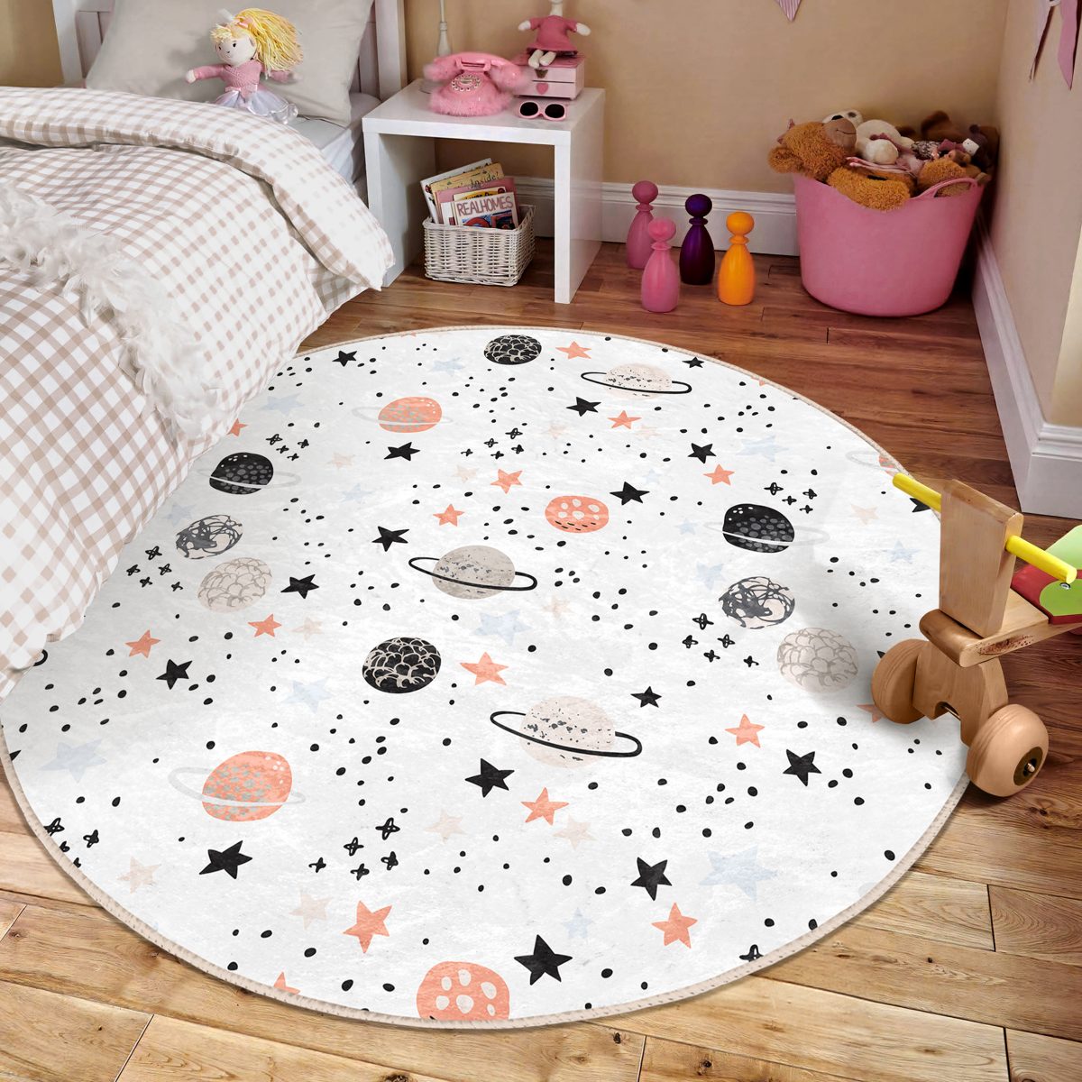 Gezegen Desenli Çocuk & Genç Odası Makinede Yıkanabilir Kaymaz Tabanlı Yuvarlak Çocuk Halısı