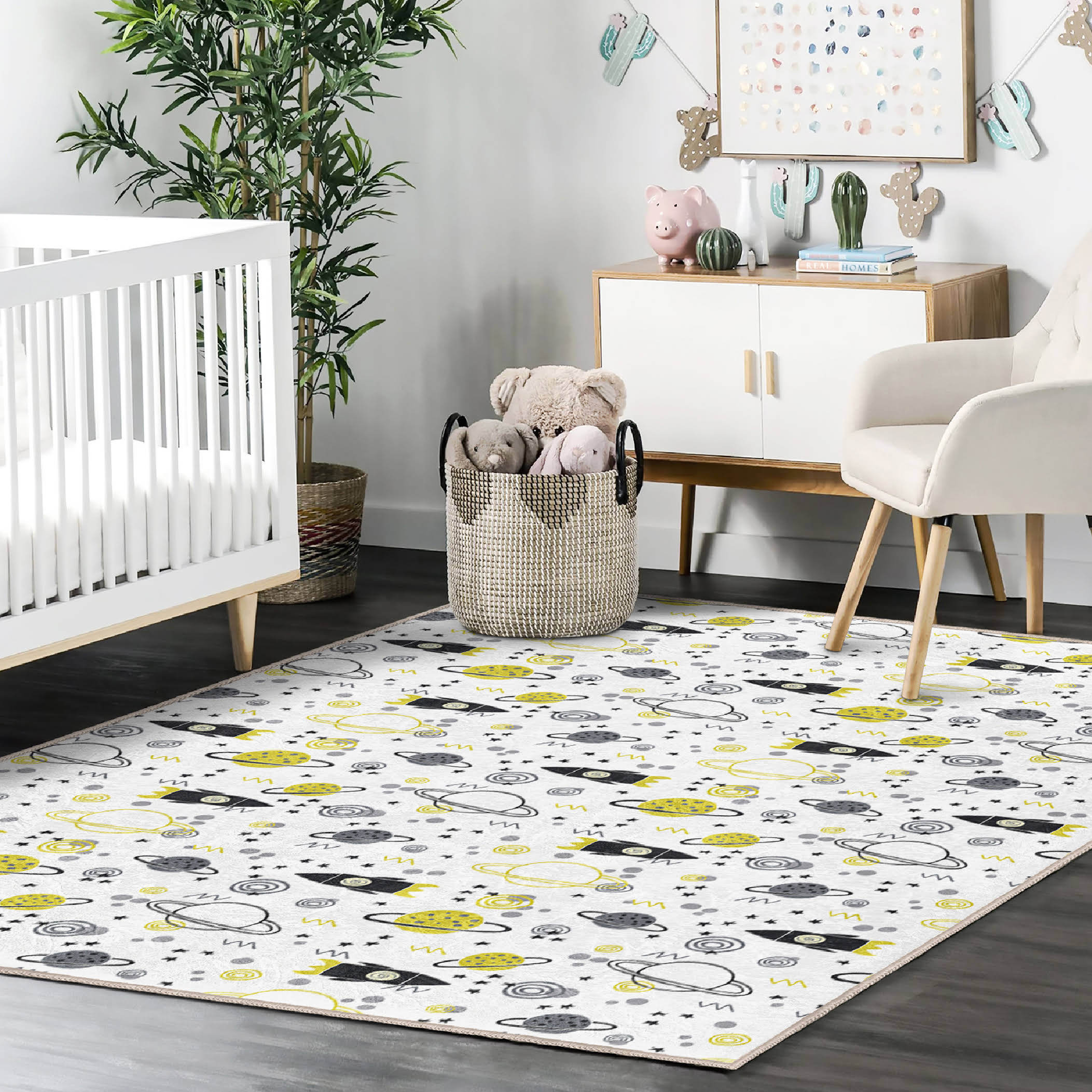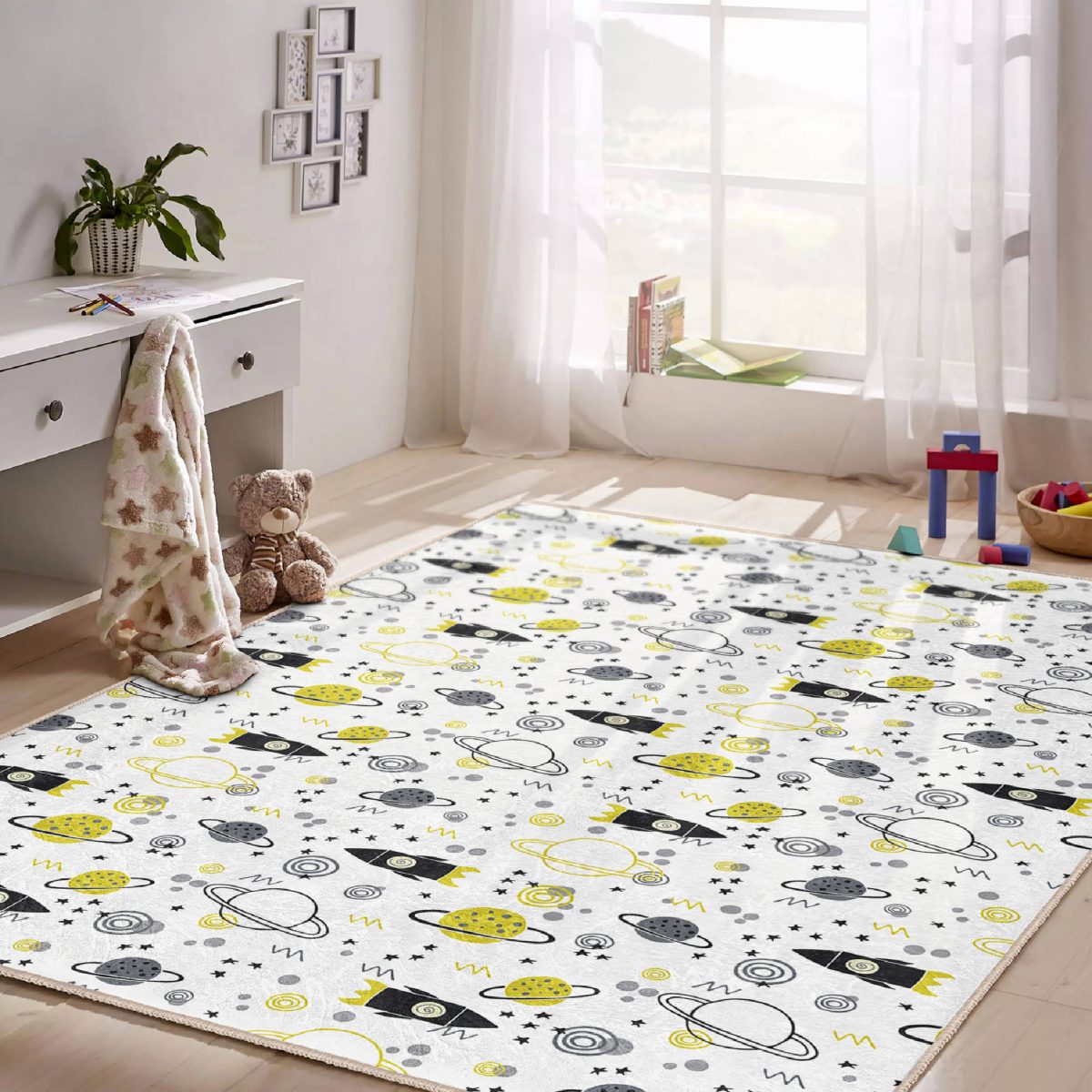 Gezegen Motifli Çocuk & Genç Odası Makinede Yıkanabilir Kolay Temizlenebilir Kaymaz Tabanlı Leke Tutmaz Dikdörtgen Çocuk Halısı