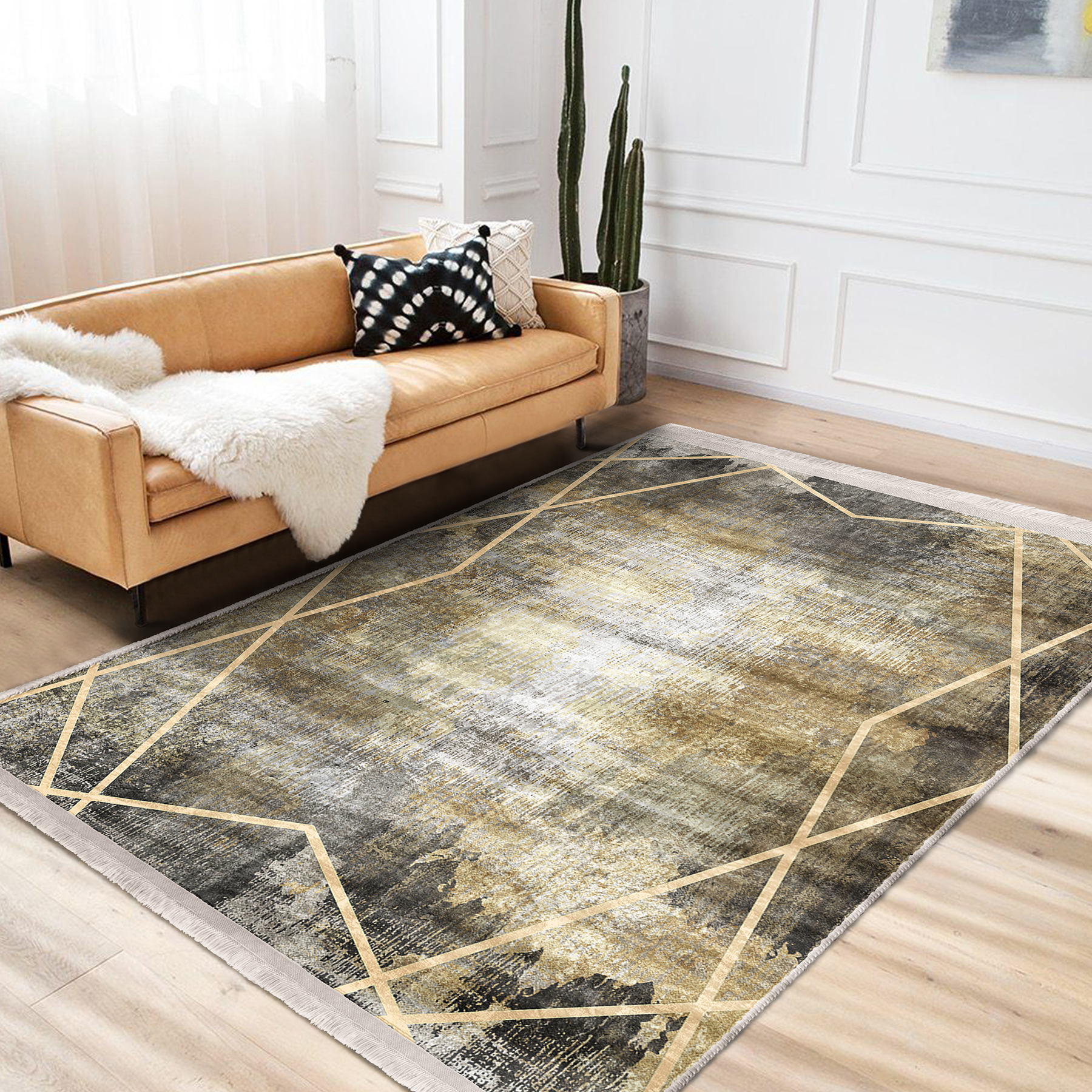 Gold – Gri Zeminde Çerçeveli Motifli Eskitme Desenli Klasik Geometrik Salon & Oturma Odası Yatak Odası Dijital Baskılı Makinede Yıkanabilir Kaymaz Taban Saçaklı Halı
