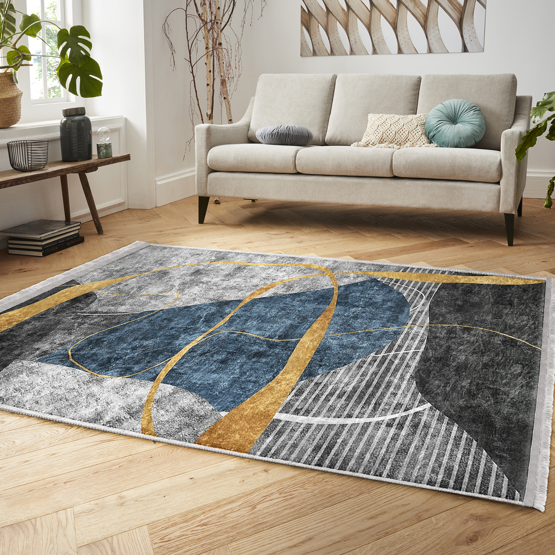 Gold – Mavi Zeminde Geometrik Motifli Gold Desenli Geometrik Klasik Salon & Oturma Odası Yatak Odası Dijital Baskılı Makinede Yıkanabilir Kaymaz Taban Saçaklı Halı