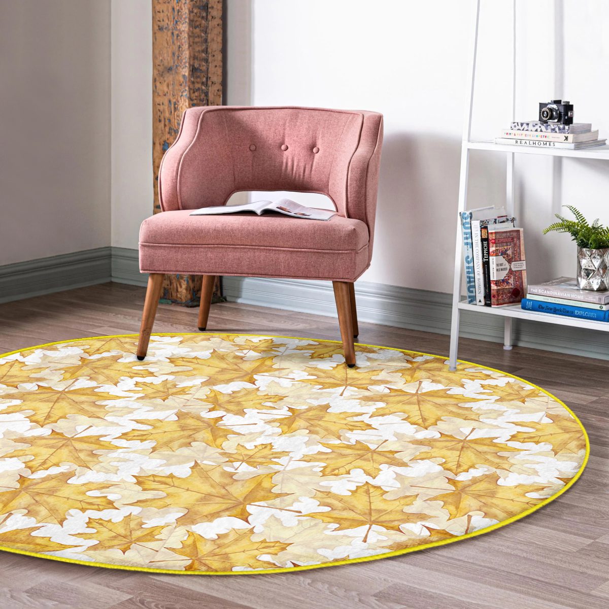 Gold Yaprak Motifli Dijital Baskılı Modern Salon ve Oturma Odası Yıkanabilir Kaymaz Tabanlı Yuvarlak Halı