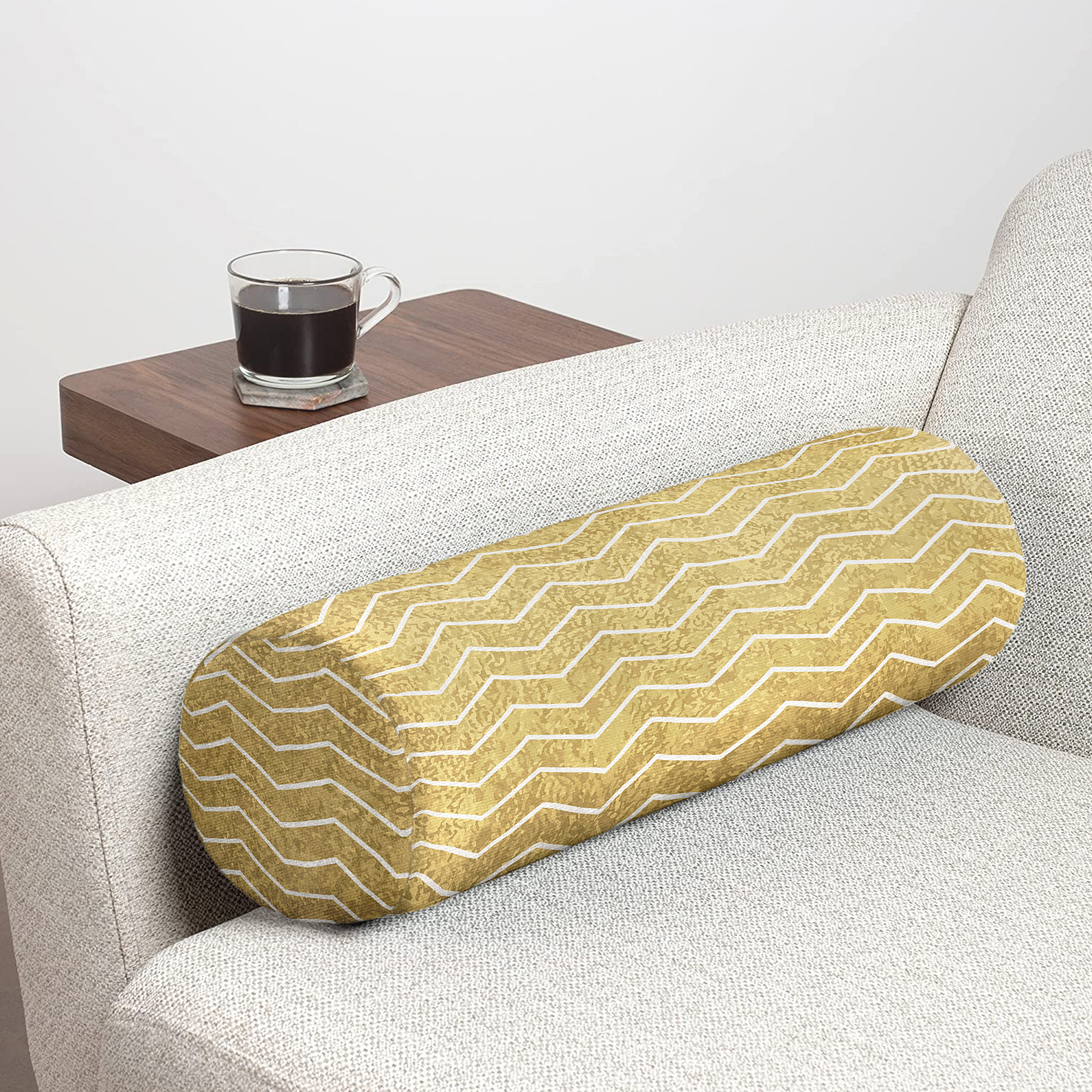 Gold Zemin Üzerinde Beyaz Geometrik Çizimli Dijital Baskılı Modern İç Dolgulu – Fermuarlı Süet Silindir Daire Yastık Kırlent