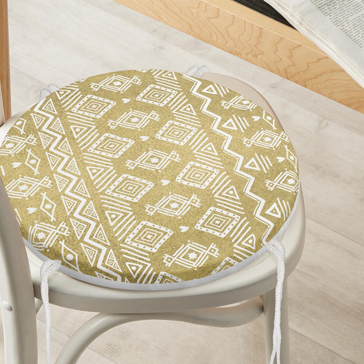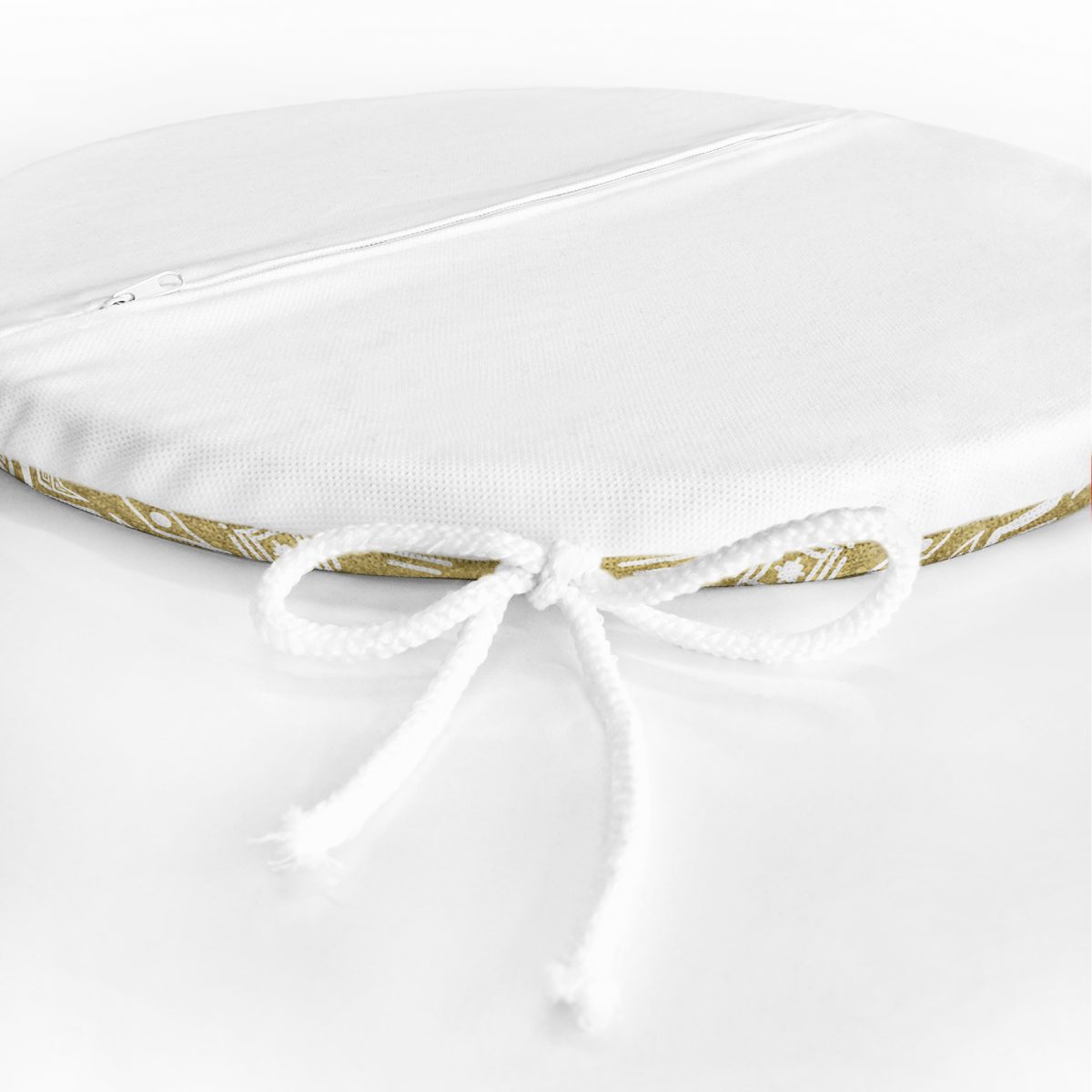 Gold Zeminde Beyaz Bohem Çizimli Dijital Baskılı Modern Yuvarlak Fermuarlı Sandalye Minderi