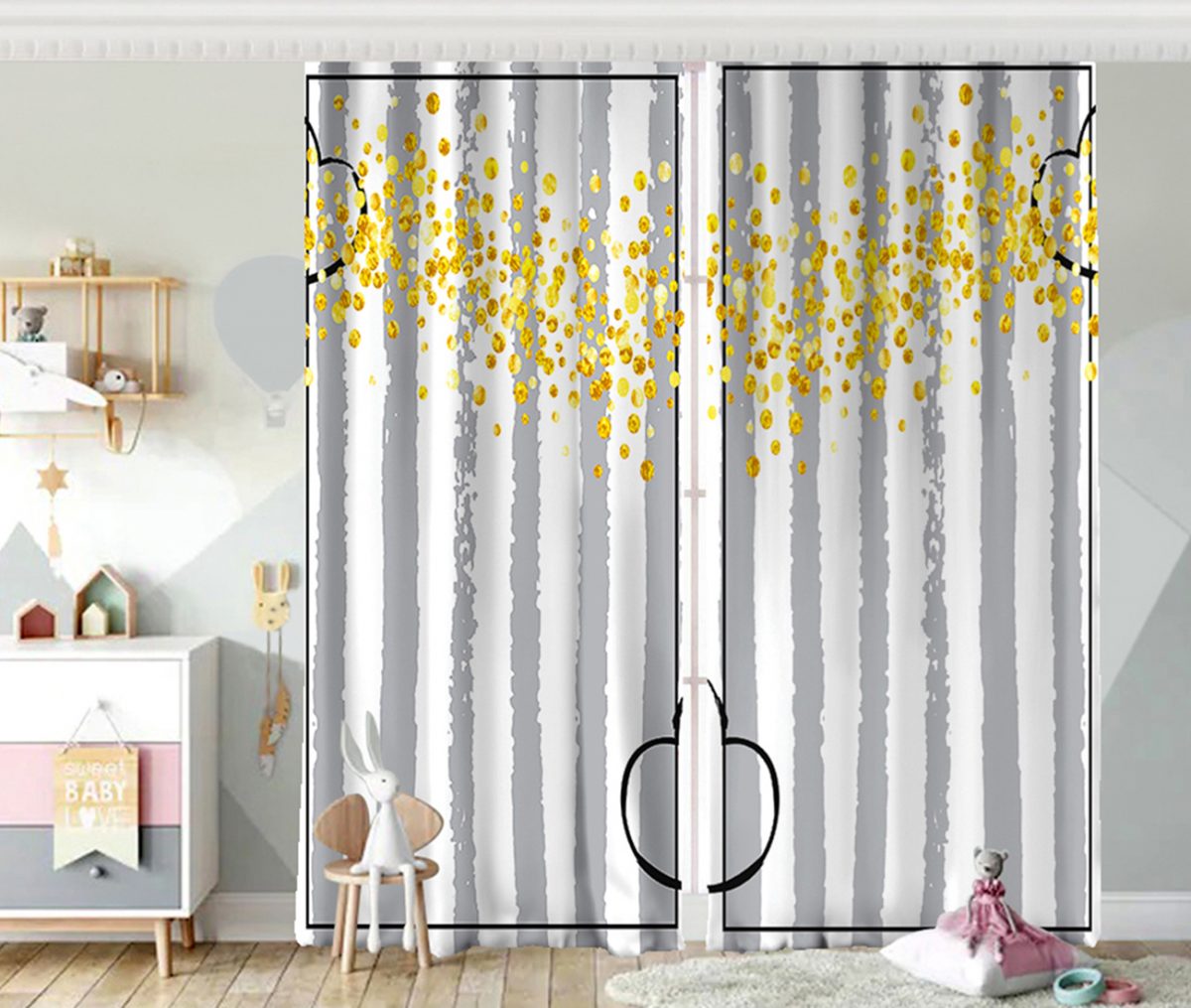 Gri Beyaz Çizgili Sarı Puanlı Temalı Çocuk Odası Fon Perde
