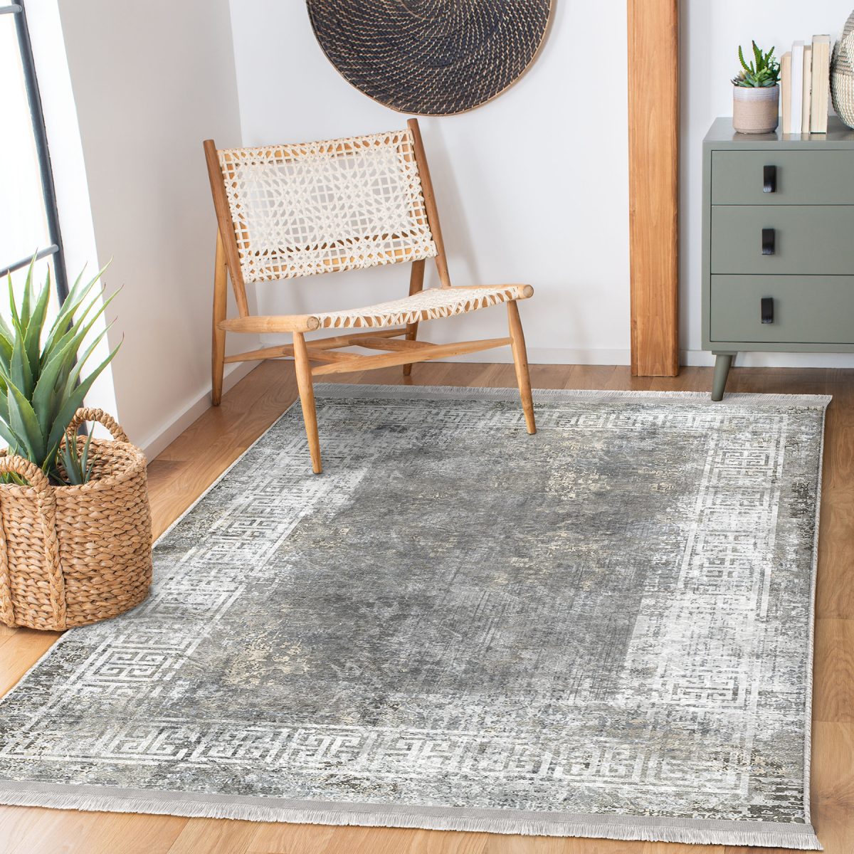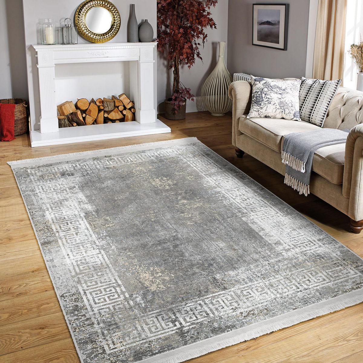 Gri – Beyaz Zeminde Çerçeveli Motifli Antik Desenli Eskitme Motifli Avangarde Salon & Oturma Odası Dış Mekan & Outdoor Dijital Baskılı Makinede Yıkanabilir Kaymaz Taban Saçaklı Halı