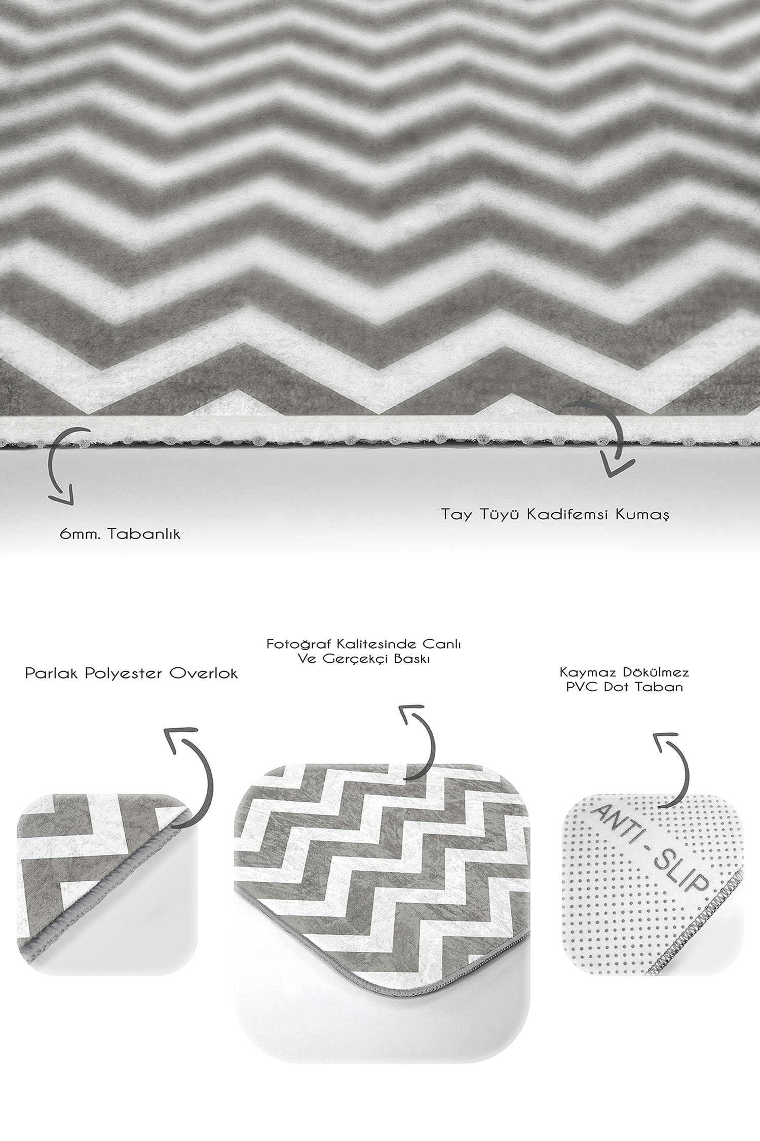 Gri Beyaz Zigzag Tasarımlı 2’li Kaymaz Tabanlı Banyo & Mutfak Paspas Takımı