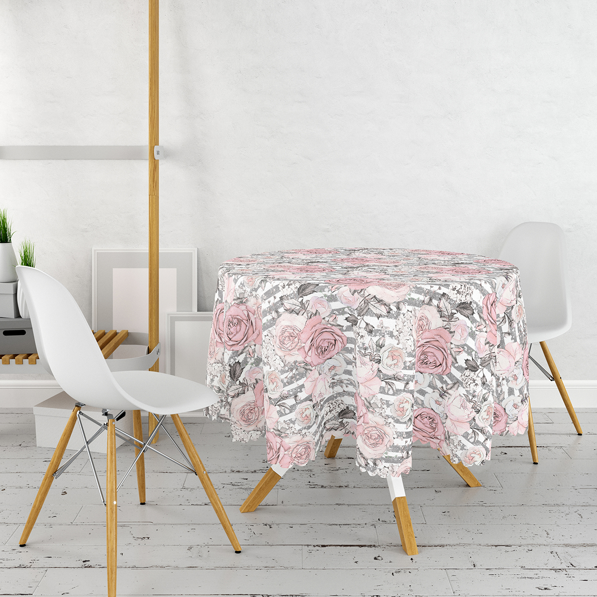 Gri Çizgi Desenli Kavaniçe Çiçek Motifli Yuvarlak Masa Örtüsü - Çap 140cm Realhomes