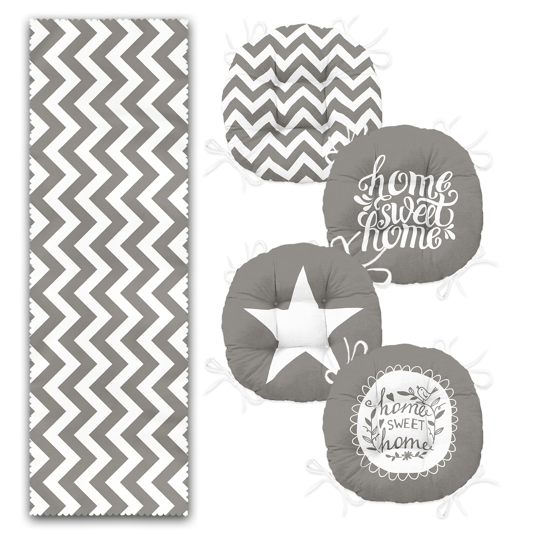 Gri Renklerin Şıklığı 4 Yuvarlak Pofuduk Sandalye Minderi ve 1 Runner Seti