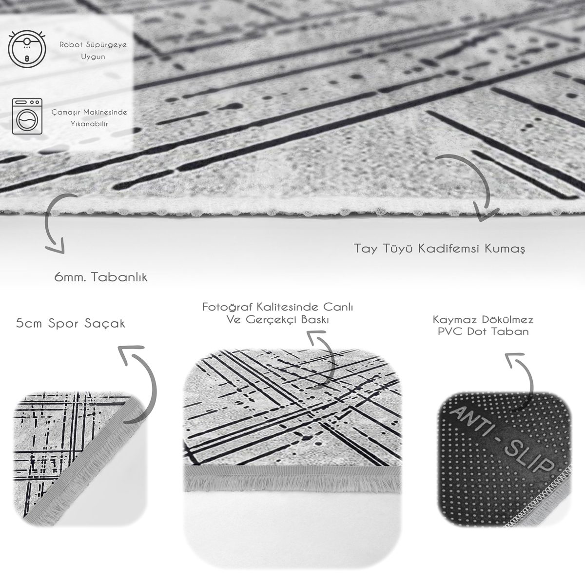 Tabanlık ve Dolgu: 5 mm Kaymaz dokuma tabanlıdır.