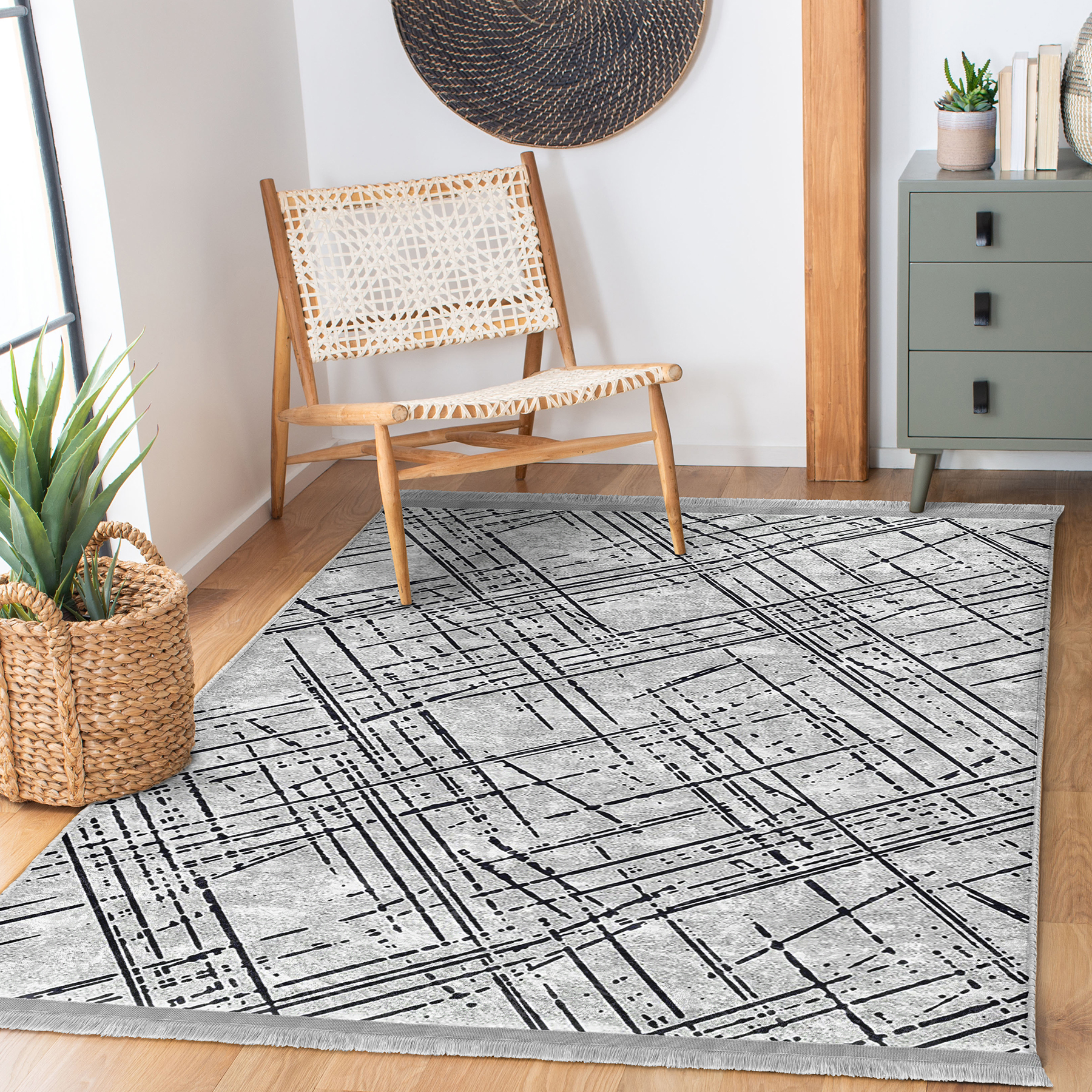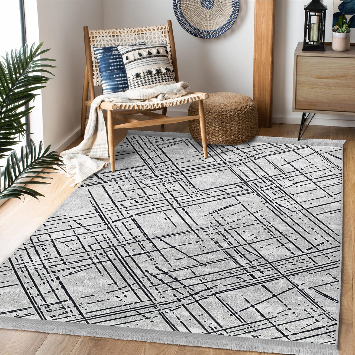 Gri – Siyah Zeminde Çizgili Motifli Eskitme Desenli Geometrik Klasik Salon & Oturma Odası Yatak Odası Dijital Baskılı Makinede Yıkanabilir Kaymaz Taban Saçaklı Halı