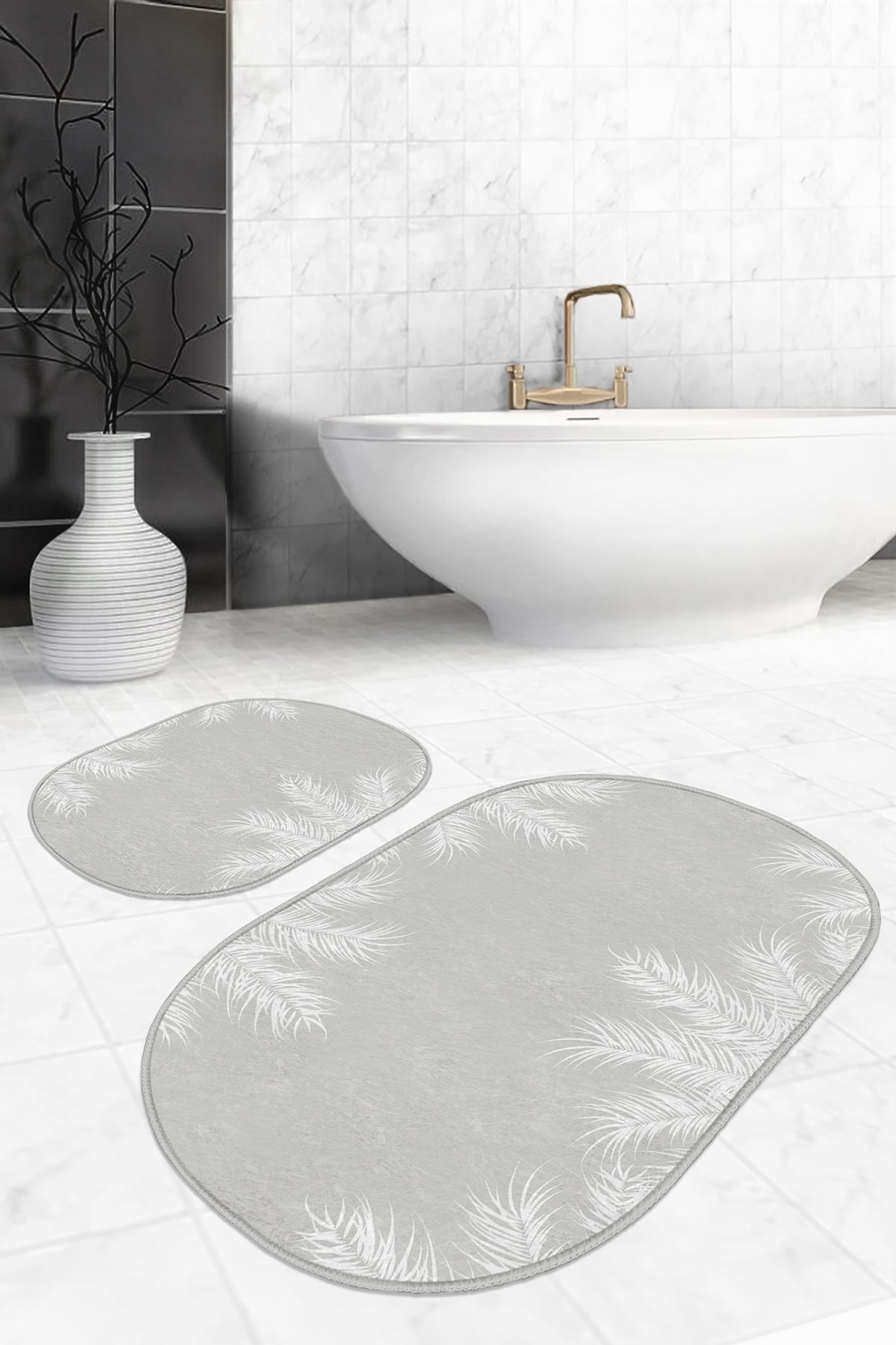 Gri Zemin Beyaz Tropik Yaprak Motifli 2’li Oval Kaymaz Tabanlı Banyo & Mutfak Paspas Takımı