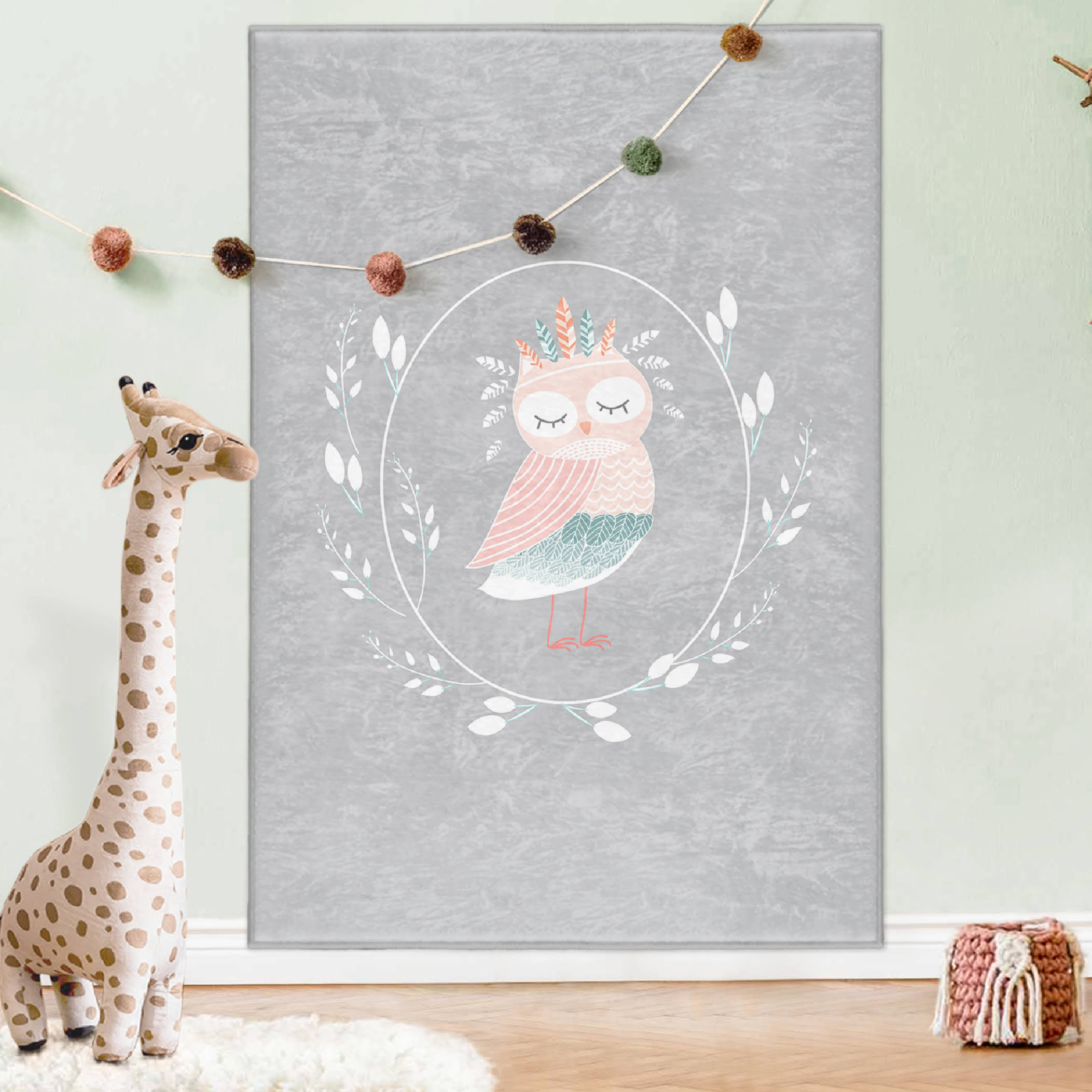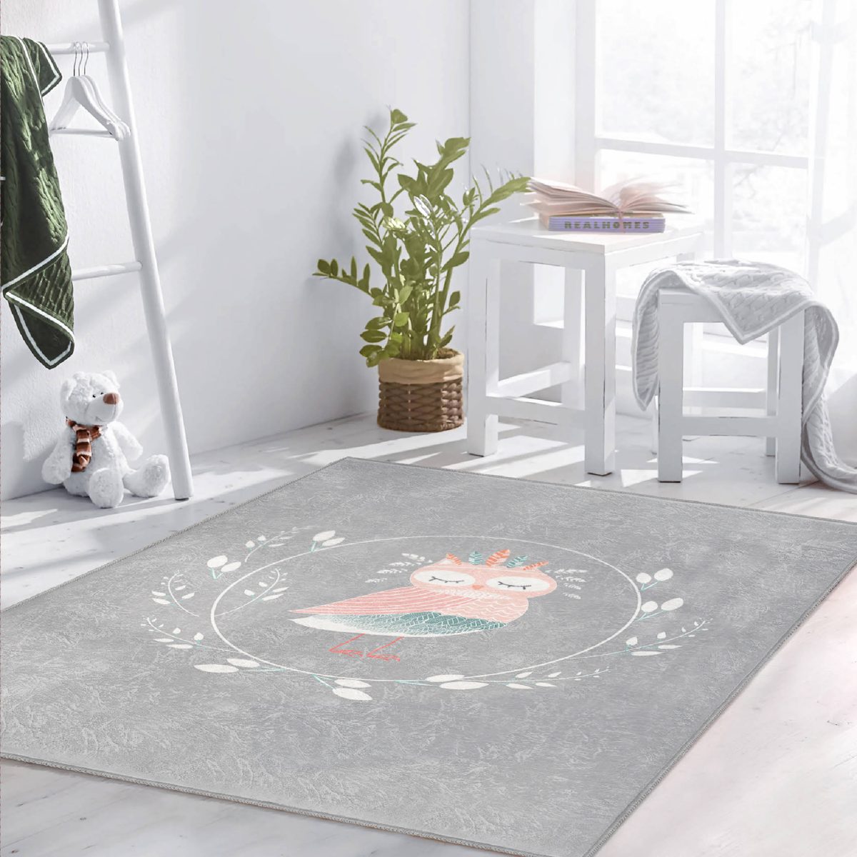 Gri Zemin I’M Beautiful Yazılı Baykuş Motifli Çocuk & Genç Odası Makinede Yıkanabilir Kaymaz Tabanlı Özel Ölçü Dikdörtgen Pamuk Tabanlı Çocuk Halısı