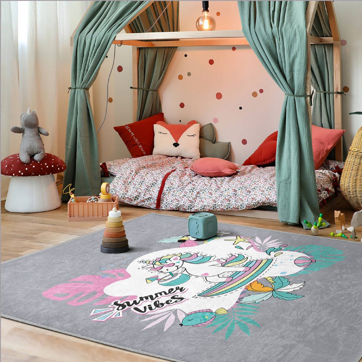 Gri Zemin Tatil Temalı Unicorn Desenli Çocuk & Genç Odası Makinede Yıkanabilir Kaymaz Tabanlı Özel Ölçü Dikdörtgen Pamuk Tabanlı Çocuk Halısı