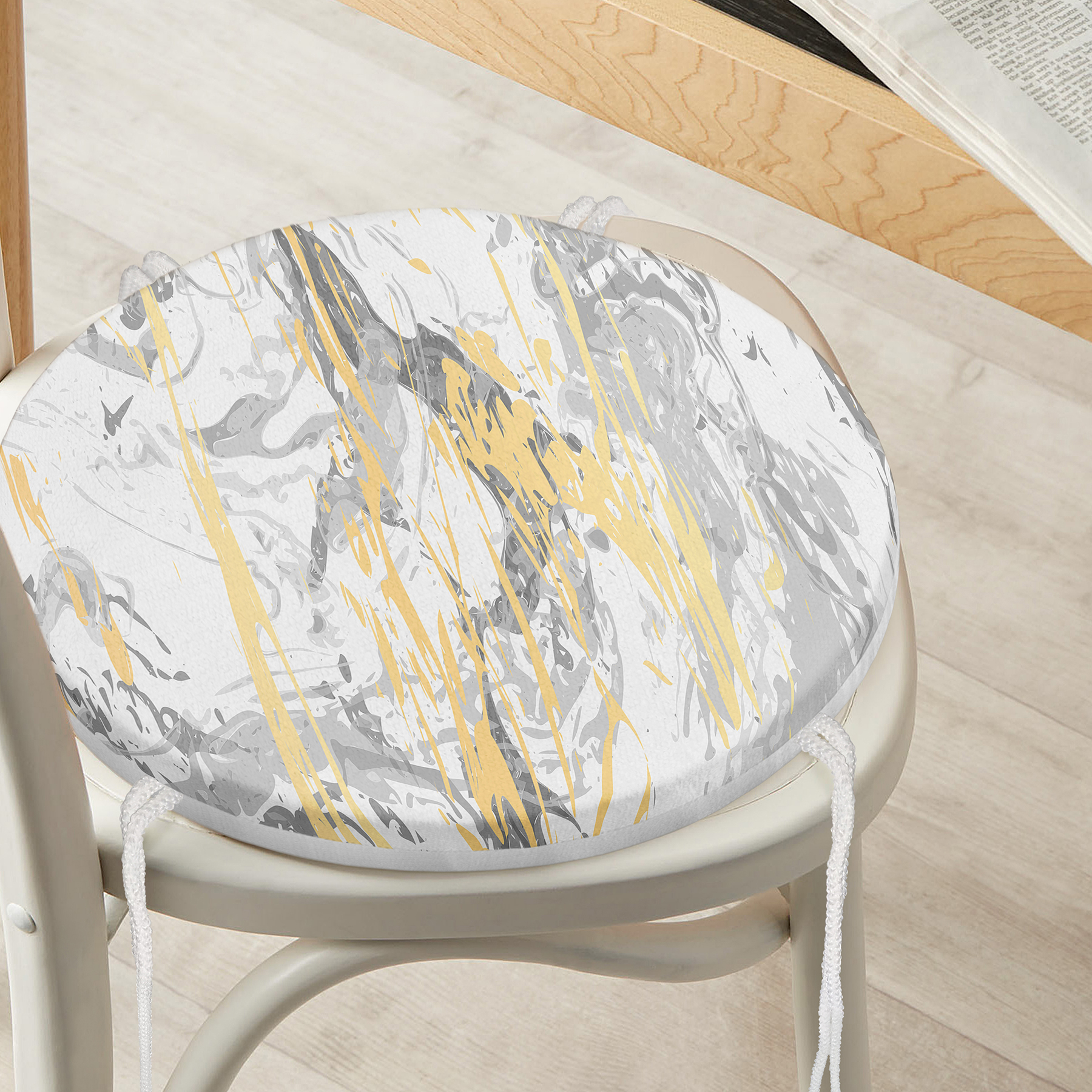 Gri Zemin Üzerinde Gold Detaylı Soft Çizim Desenli Dijital Baskılı Modern Yuvarlak Fermuarlı Sandalye Minderi