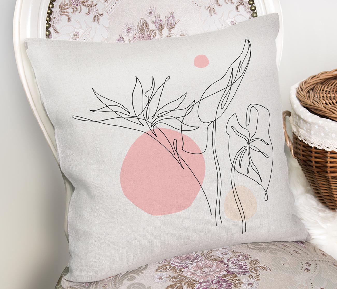 Gri Zemin Üzerinde Karakalem Çiçek Çizimli Modern Kırlent Kılıfı Realhomes