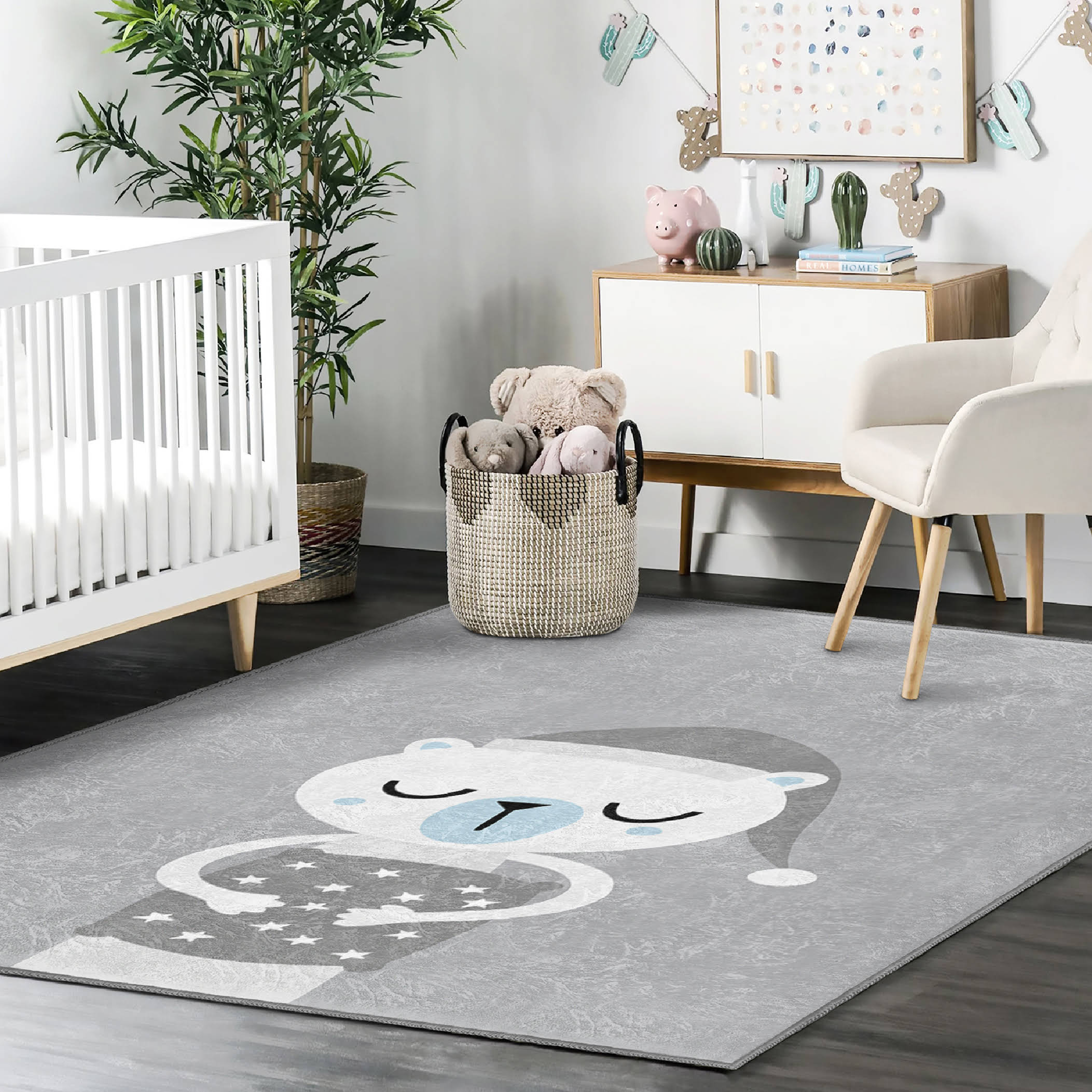 Gri Zeminde Ayıcık Tasarımlı Çocuk & Genç Odası Makinede Yıkanabilir Kaymaz Tabanlı Dekoratif Pamuk Tabanlı Dikdörtgen Çocuk Halısı