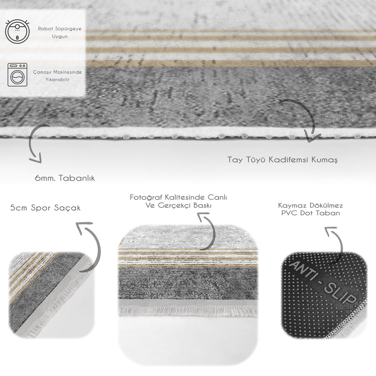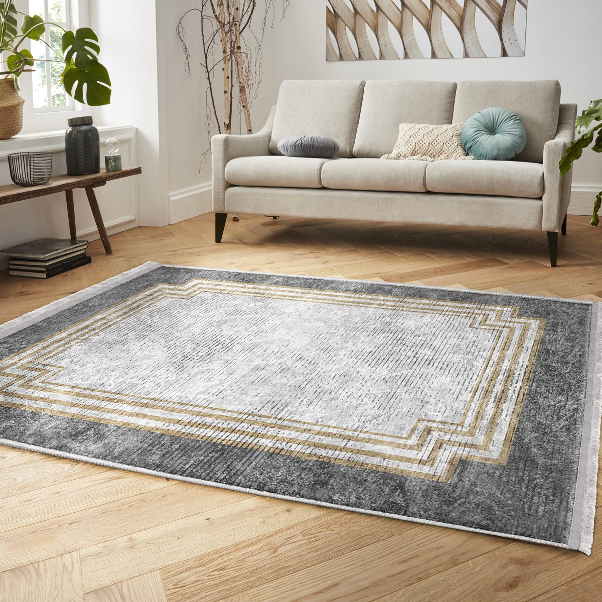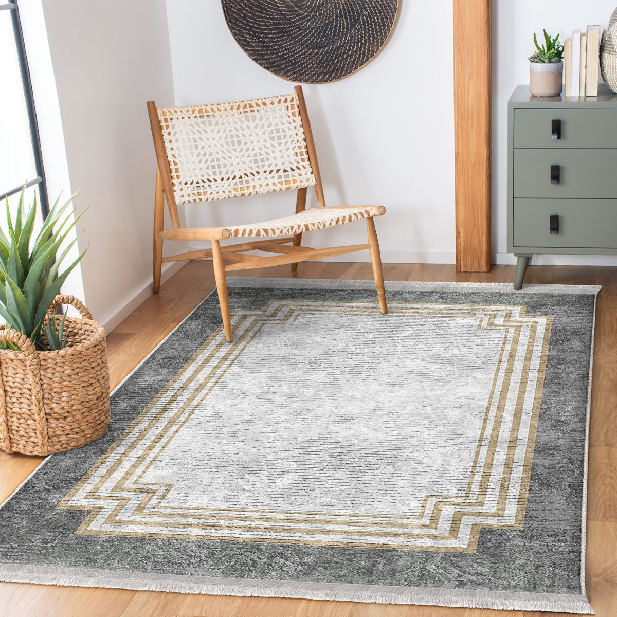Gri Zeminde Çerçeveli Motifli Antik Desenli Geometrik Klasik Salon & Oturma Odası Yatak Odası Dijital Baskılı Makinede Yıkanabilir Kaymaz Taban Saçaklı Halı