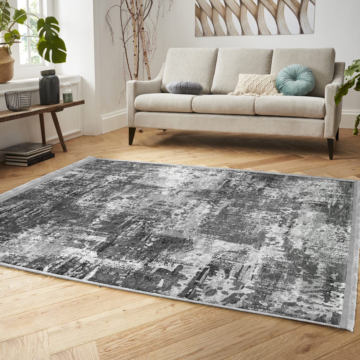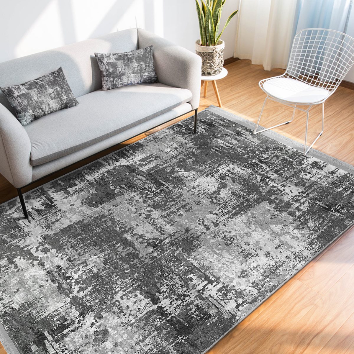 Gri Zeminde Eskitme Motifli Dokuma Halı Desenli Eskitme Motifli Vintage Koridor & Antre Salon & Oturma Odası Dijital Baskılı Makinede Yıkanabilir Kaymaz Taban Saçaklı Halı