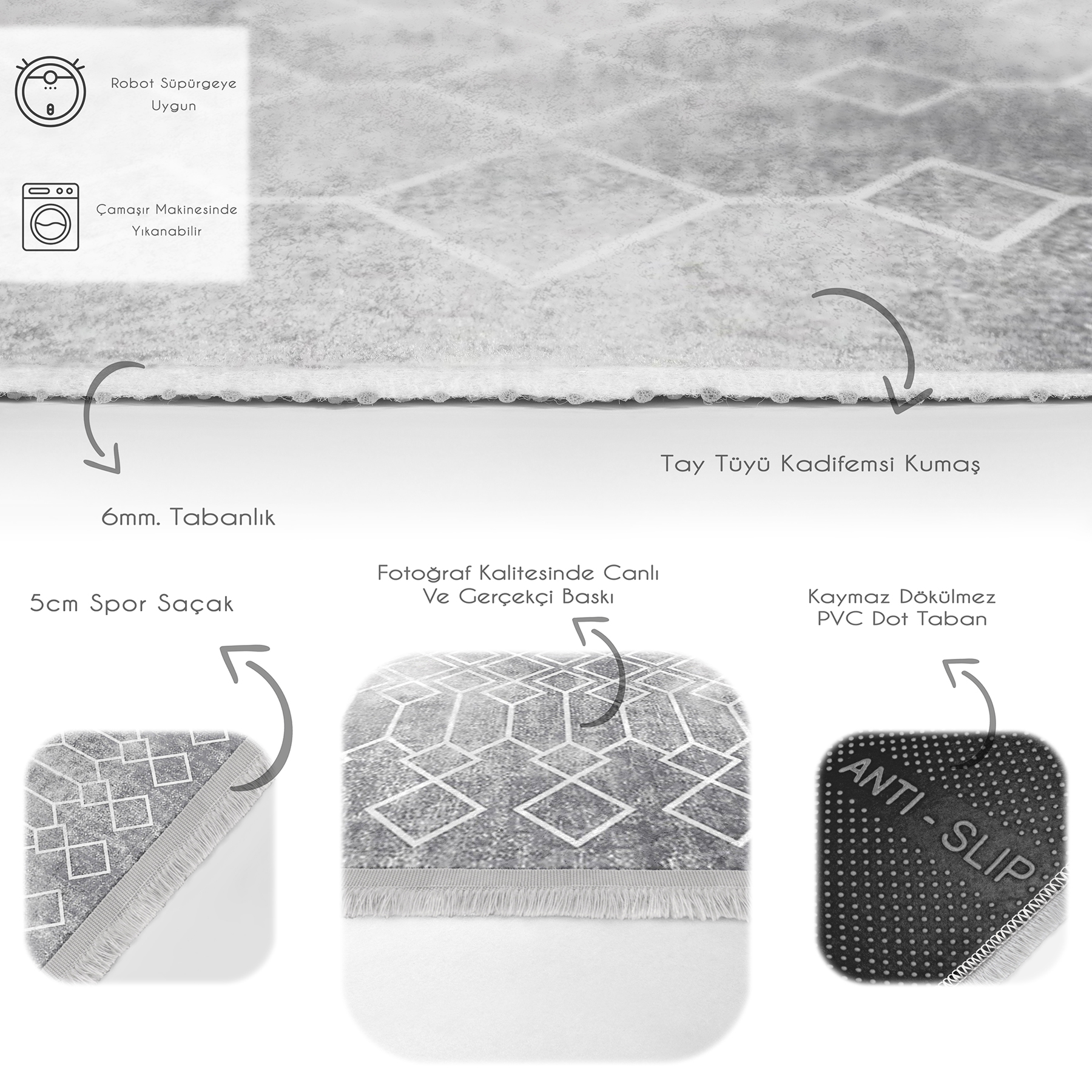 Tabanlık ve Dolgu: 5 mm Kaymaz dokuma tabanlıdır.