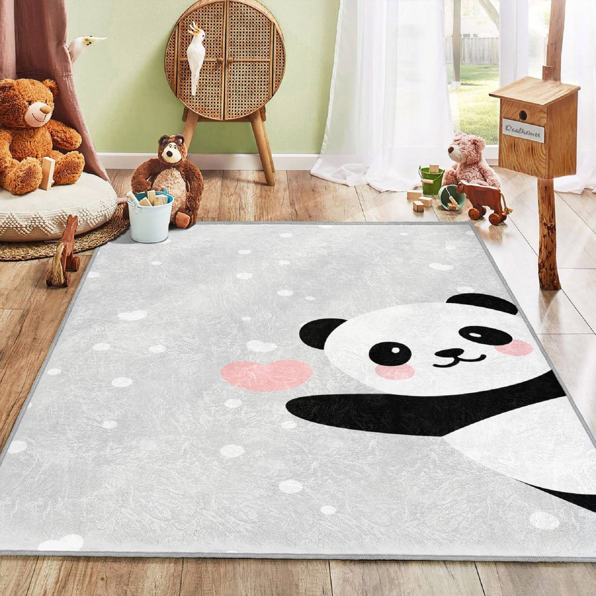Gri Zeminde Panda Temalı Çocuk & Genç Odası Makinede Yıkanabilir Kaymaz Tabanlı Dekoratif Pamuk Tabanlı Dikdörtgen Çocuk Halısı