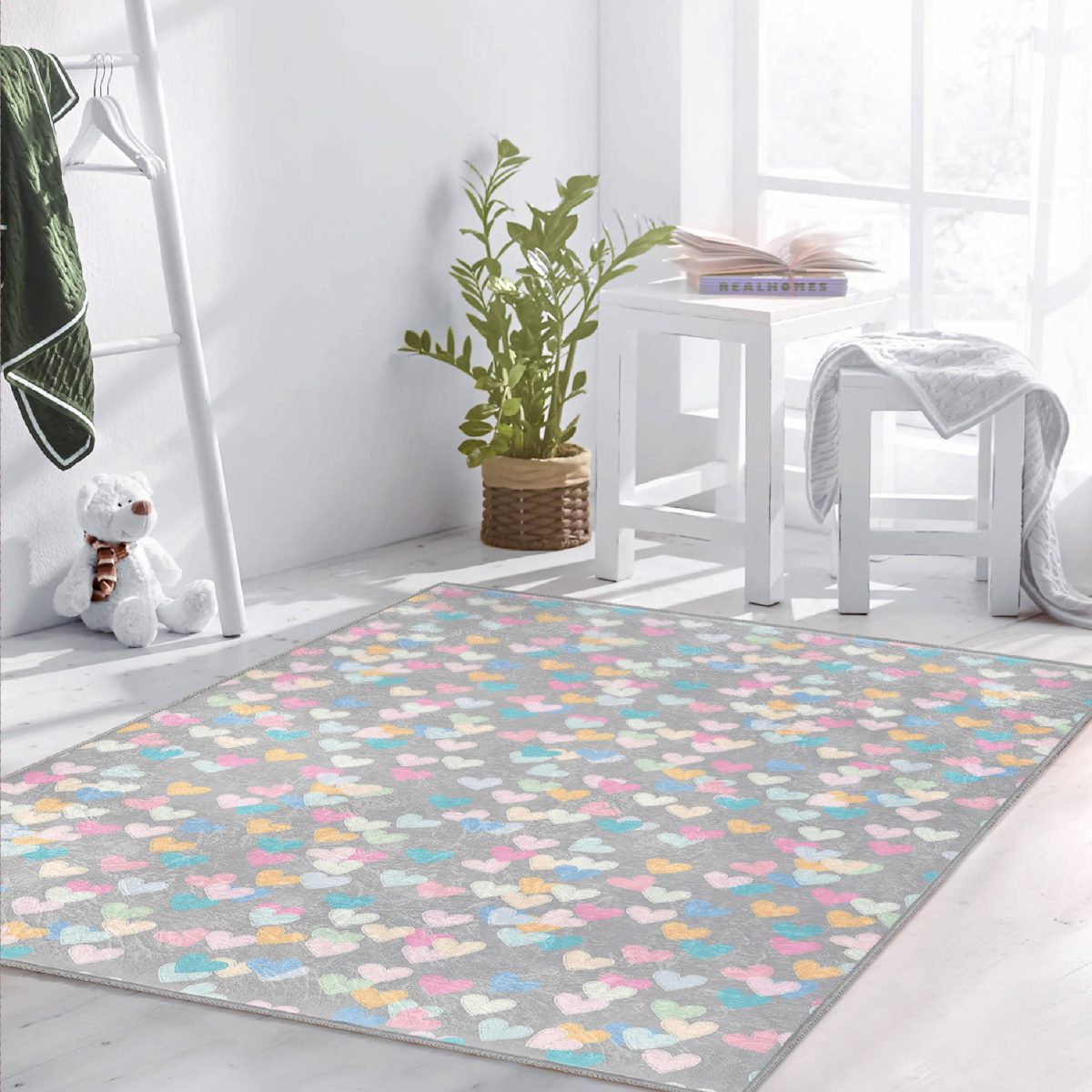 Gri Zeminde Rengarenk Kalpler Çocuk & Genç Odası Makinede Yıkanabilir Kaymaz Tabanlı Pamuk Tabanlı Dikdörtgen Özel Ölçü Çocuk Halısı