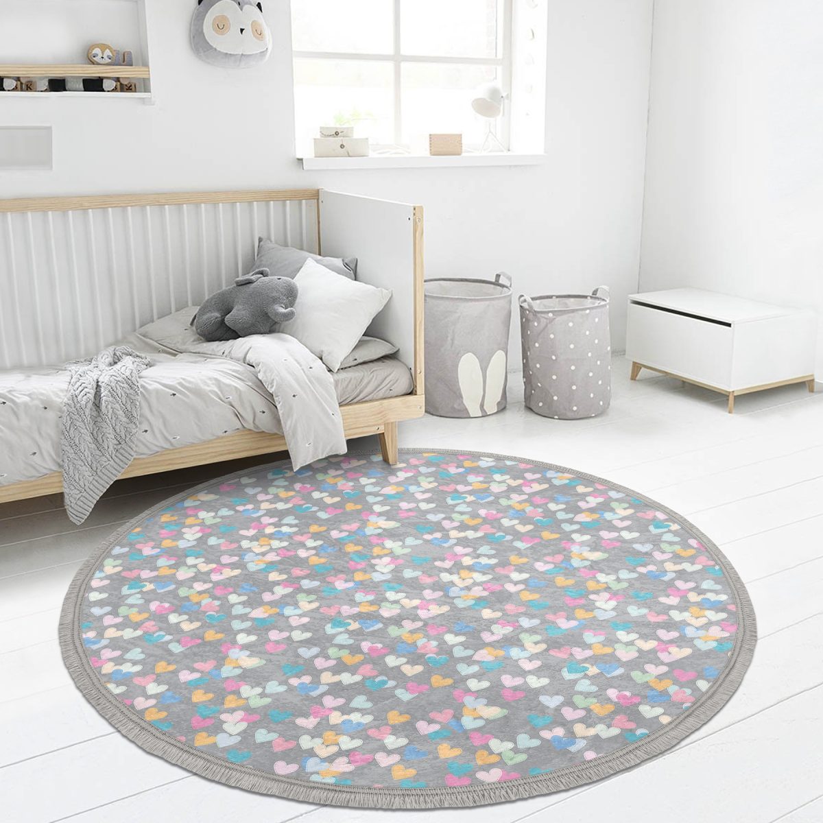 Gri Zeminde Rengarenk Kalpler Çocuk & Genç Odası Makinede Yıkanabilir Kaymaz Tabanlı Püsküllü Yuvarlak Çocuk Halısı