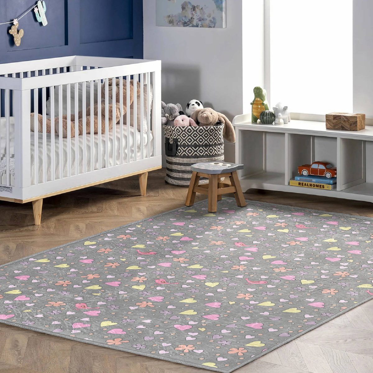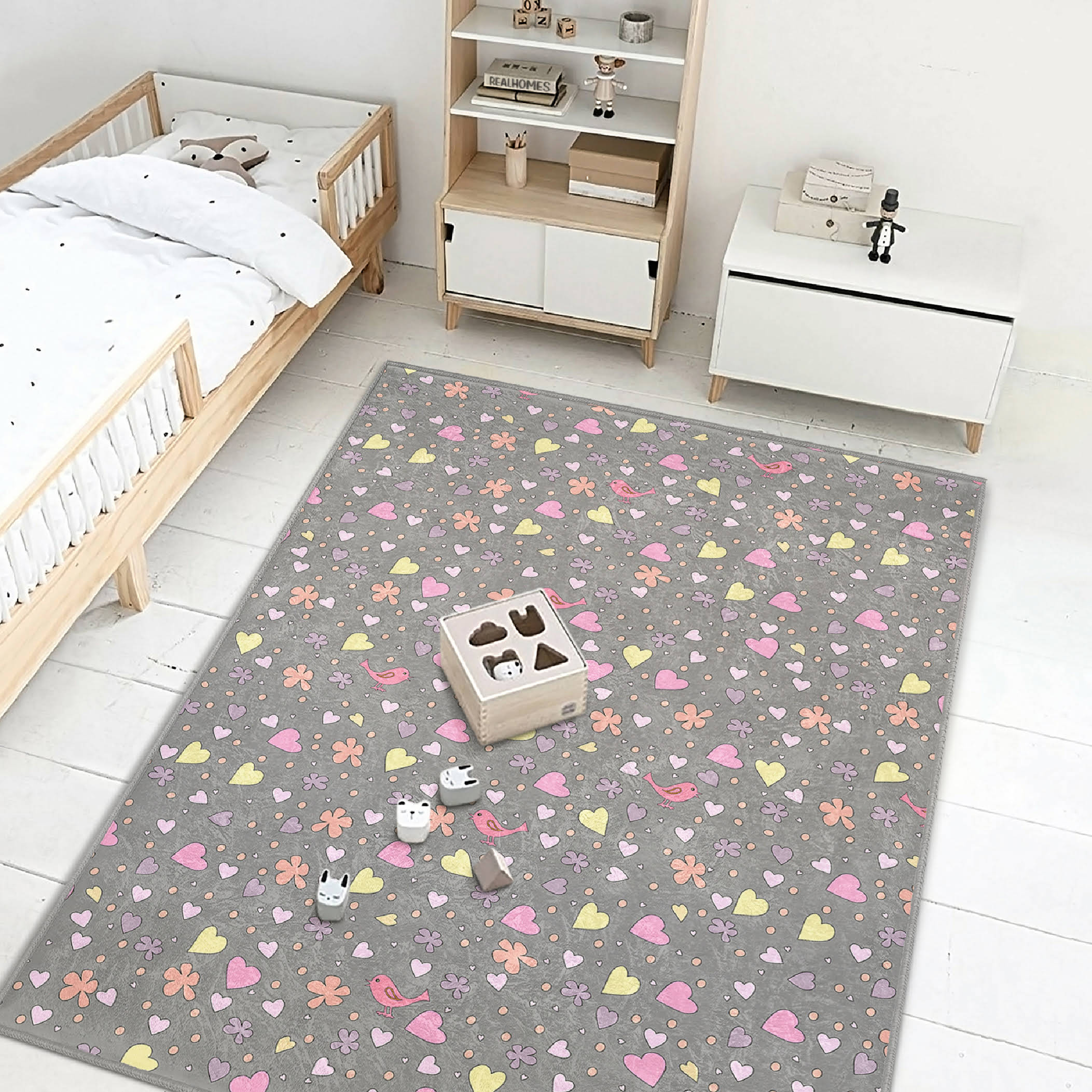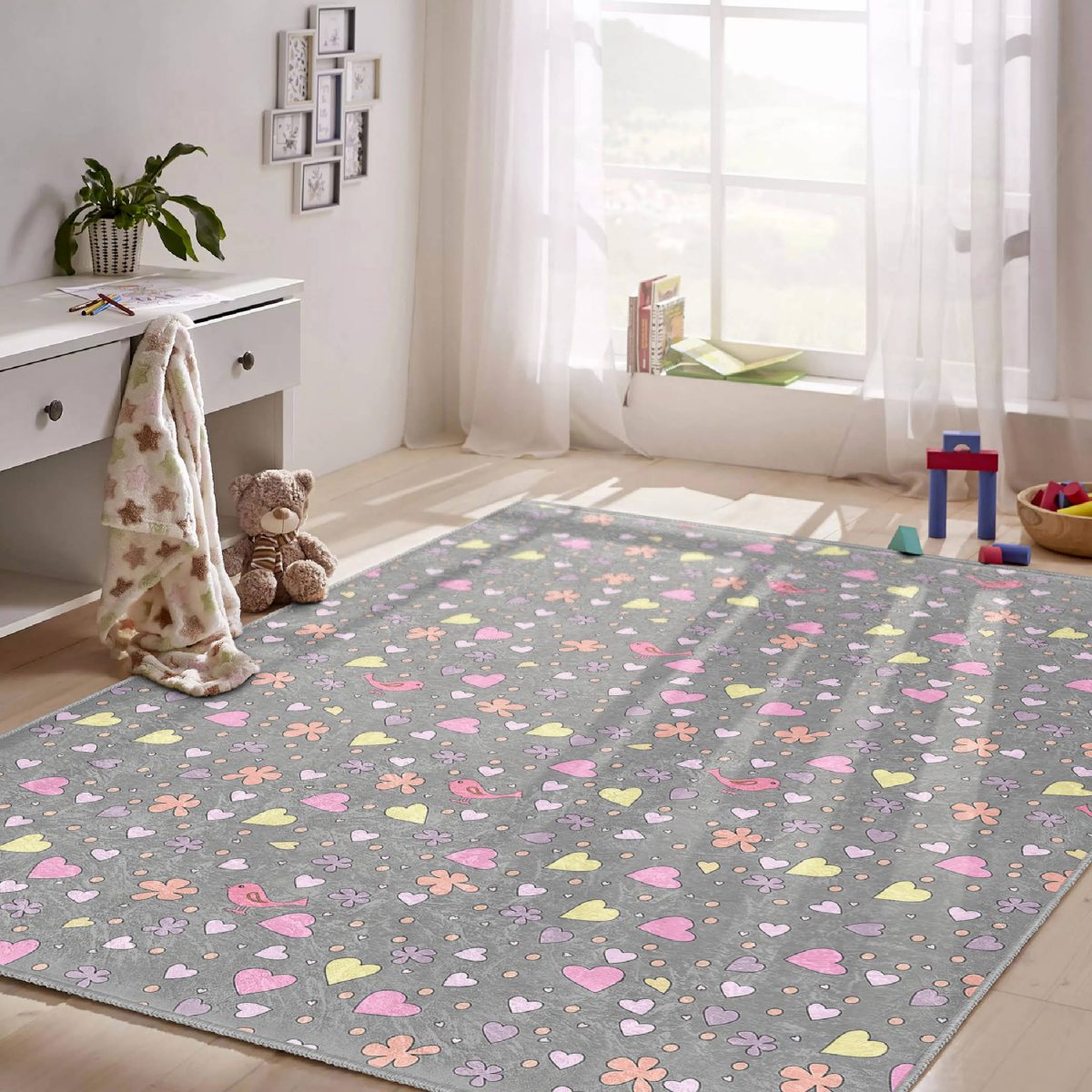Gri Zeminde Renkli Çiçek Ve Kalp Tasarımlı Çocuk & Genç Odası Makinede Yıkanabilir Kaymaz Tabanlı Dikdörtgen Çocuk Halısı