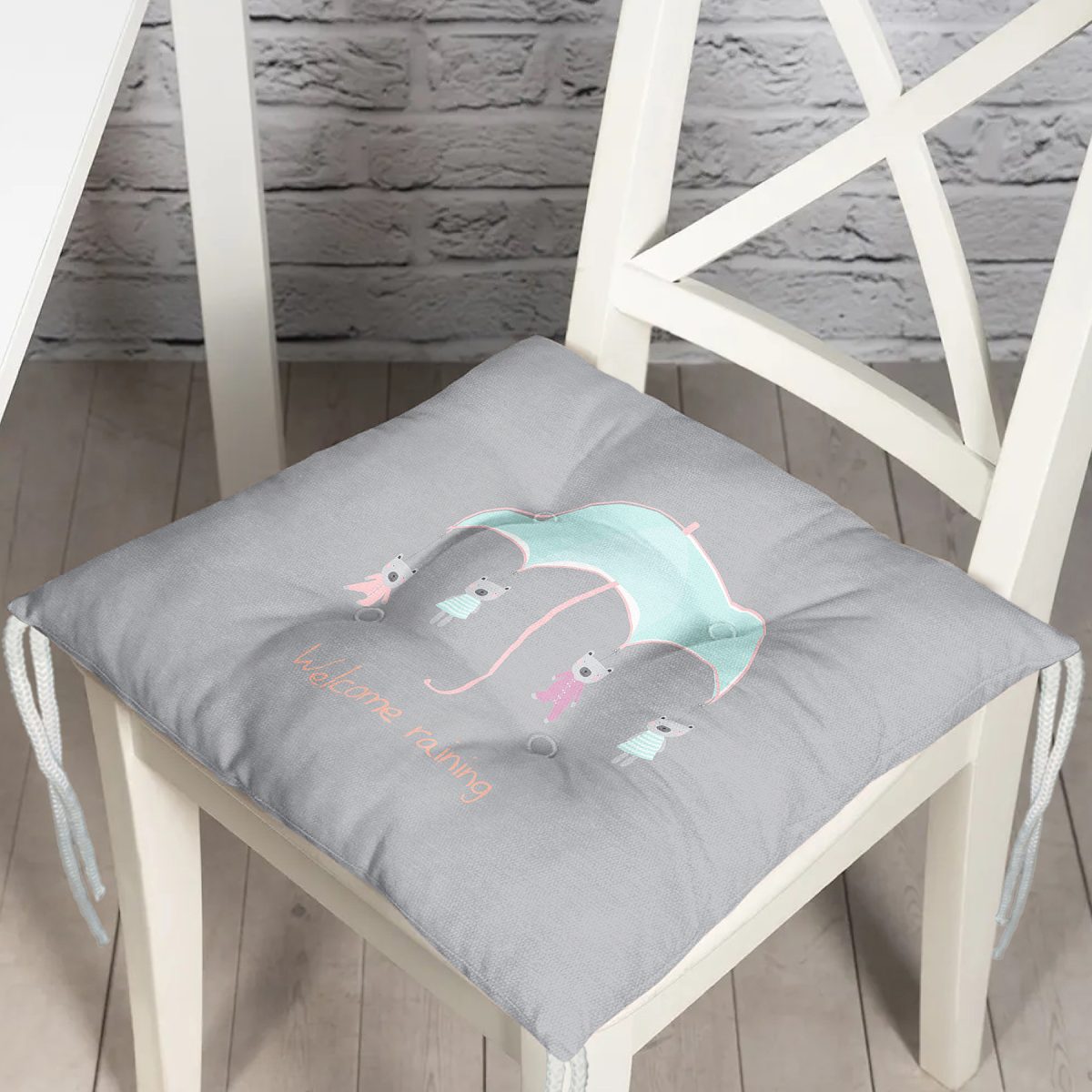 Gri Zeminde Şemsiye ve Sevimli Ayıcıklar Motifli Modern Pofuduk Sandalye Minderi