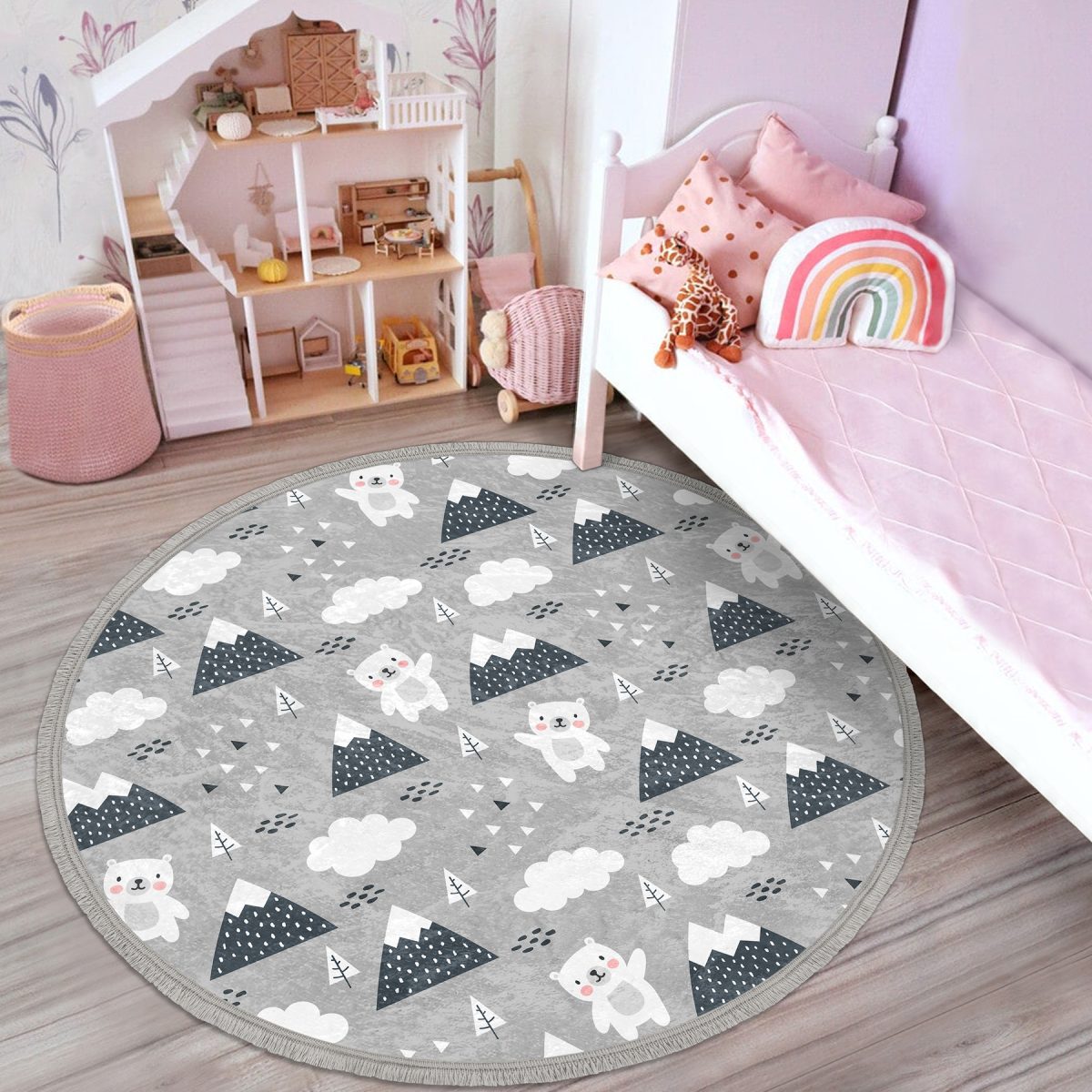 Gri Zeminde Sevimli Ayı Desenli Çocuk & Genç Odası Makinede Yıkanabilir Kaymaz Tabanlı Püsküllü Yuvarlak Çocuk Halısı
