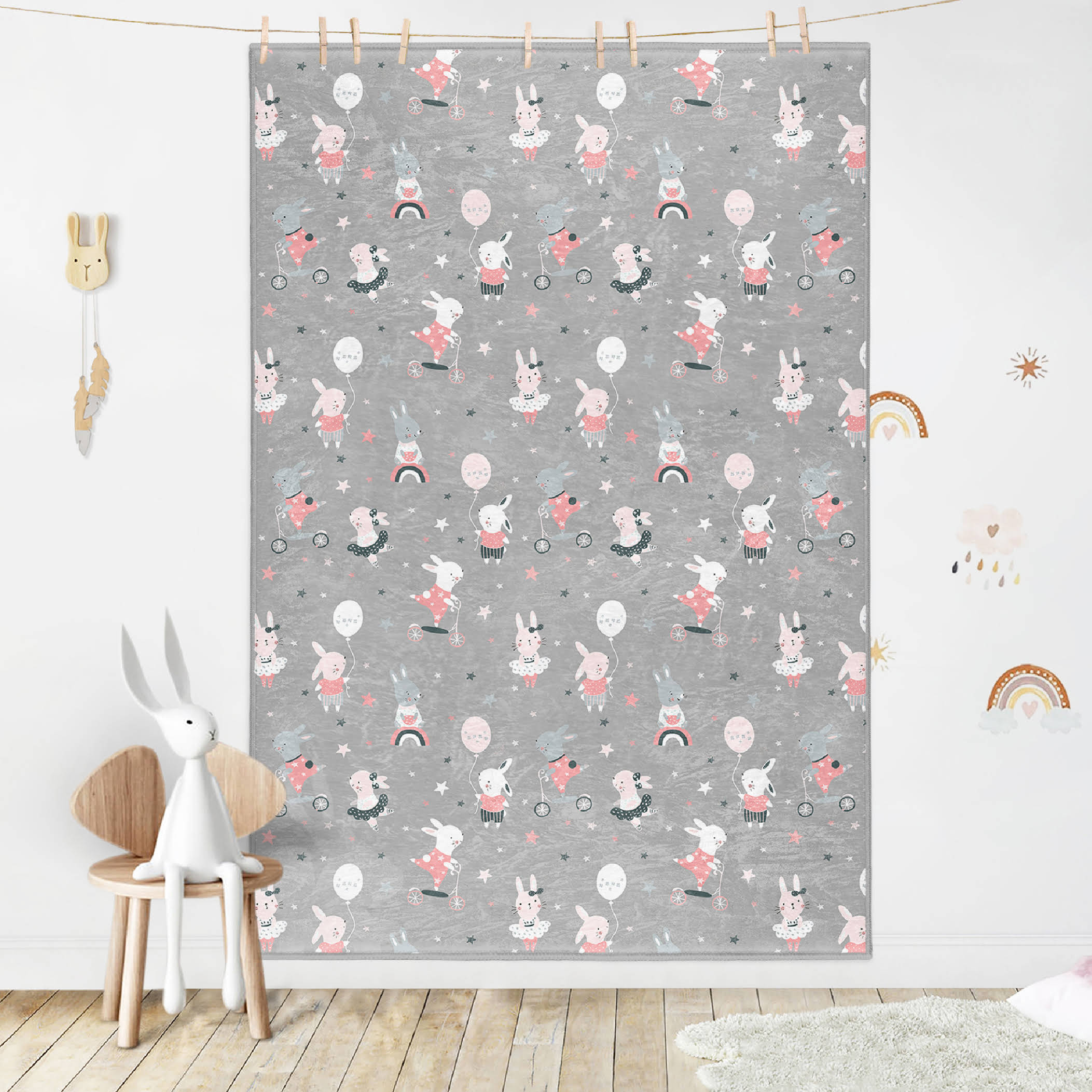 Gri Zeminde Sevimli Tavşanlar Çocuk & Genç Odası Makinede Yıkanabilir Leke Tutmaz Kaymaz Tabanlı Dikdörtgen Çocuk Halısı