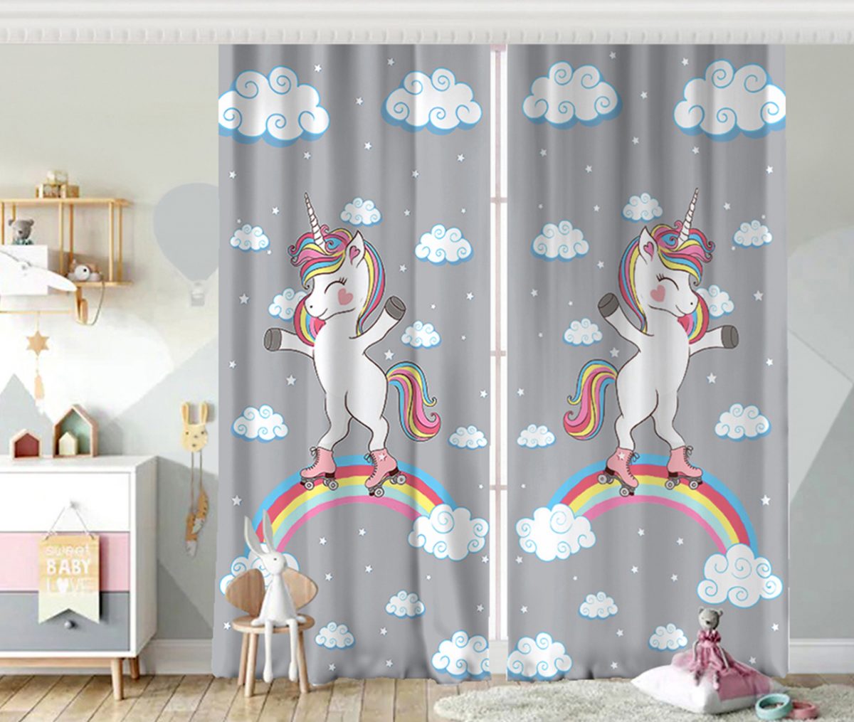 Gri Zeminde Unicorn At Desenli Çocuk Odası Fon Perde