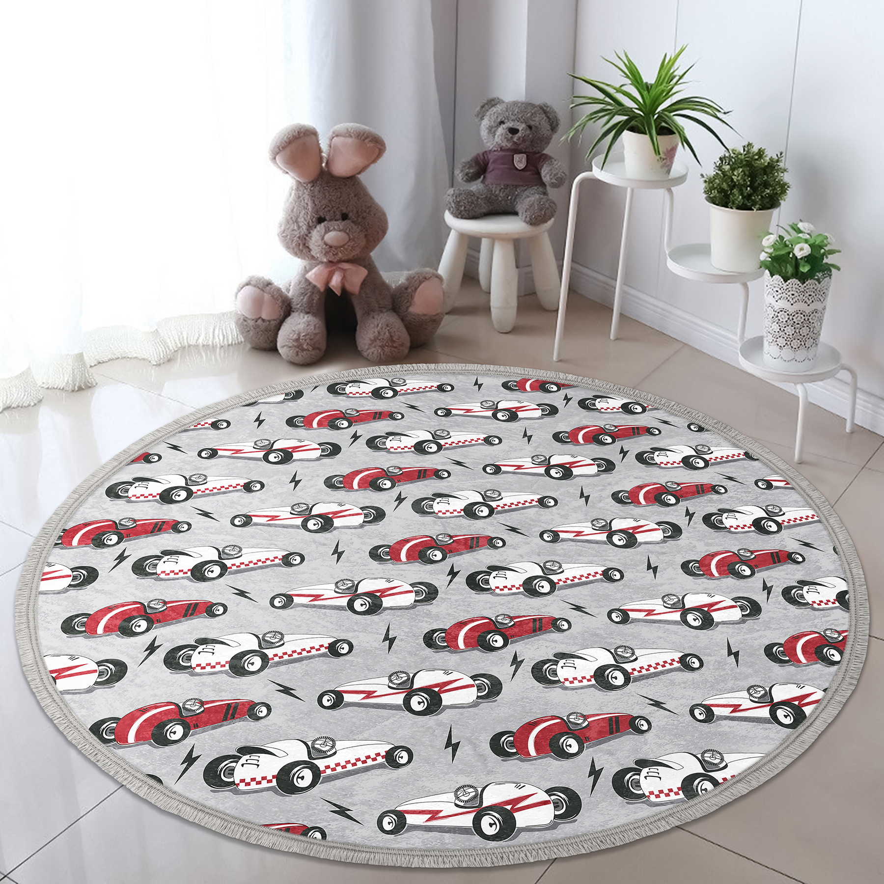 Gri Zeminde Yarış Arabalı Çocuk & Genç Odası Makinede Yıkanabilir Kaymaz Tabanlı Püsküllü Yuvarlak Çocuk Halısı