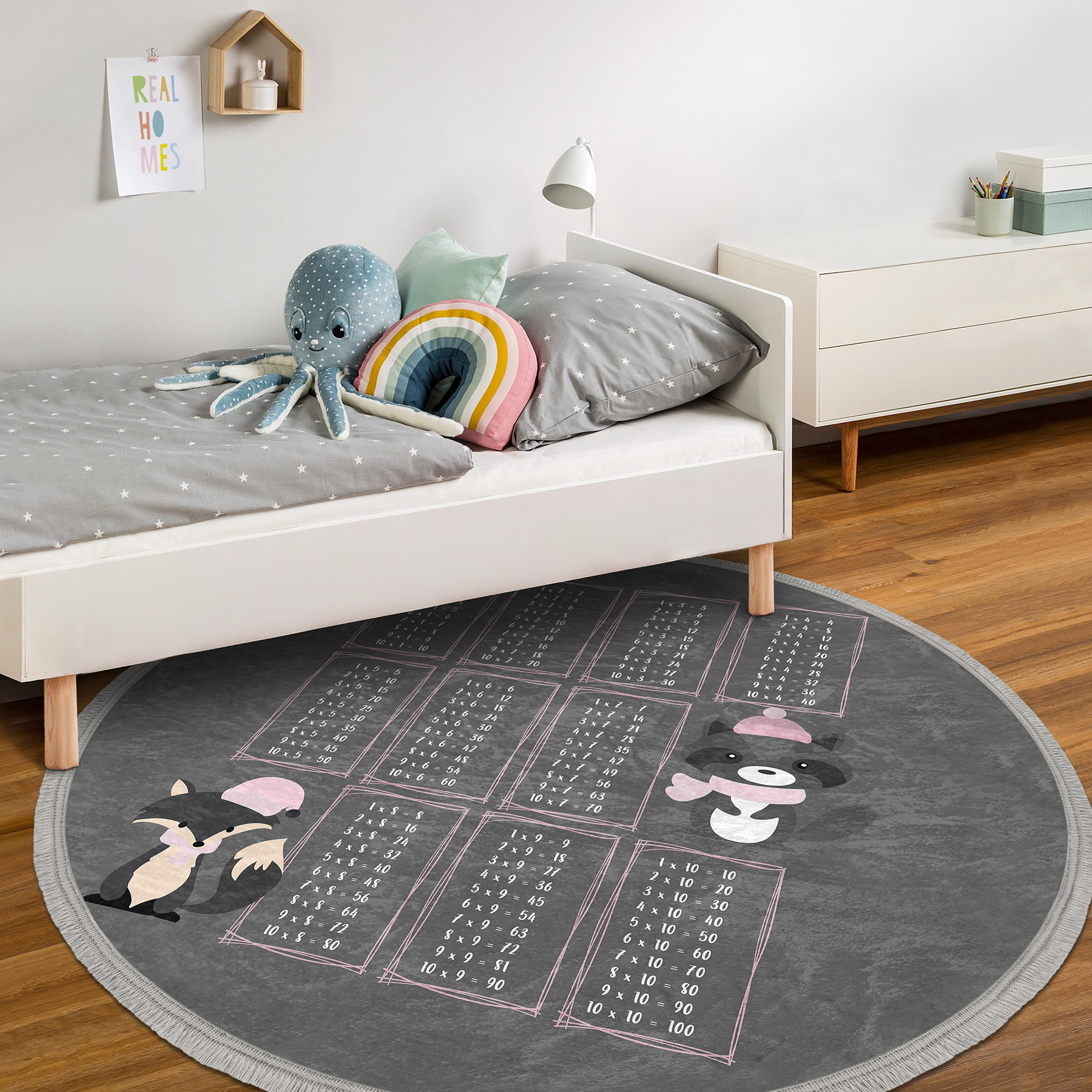 Gri Zeminli Eğitici Çarpım Tablosu Çizimli Çocuk & Genç Odası Makinede Yıkanabilir Kaymaz Tabanlı Püsküllü Yuvarlak Çocuk Oyun Halısı