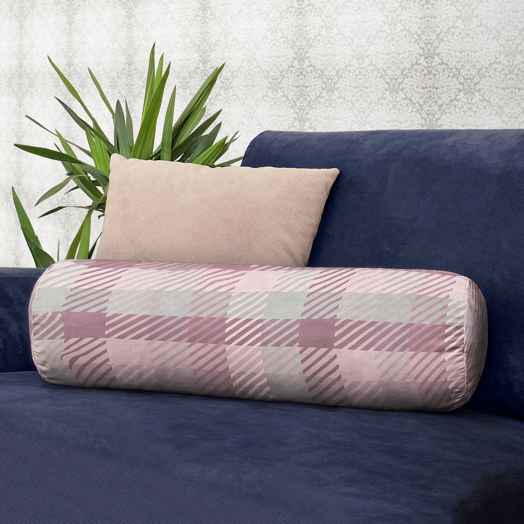 Gri Zeminli Ekose Desenli Dekoratif İç Dolgulu Fermuarlı Çok Amaçlı Silindir Yastık Kırlent