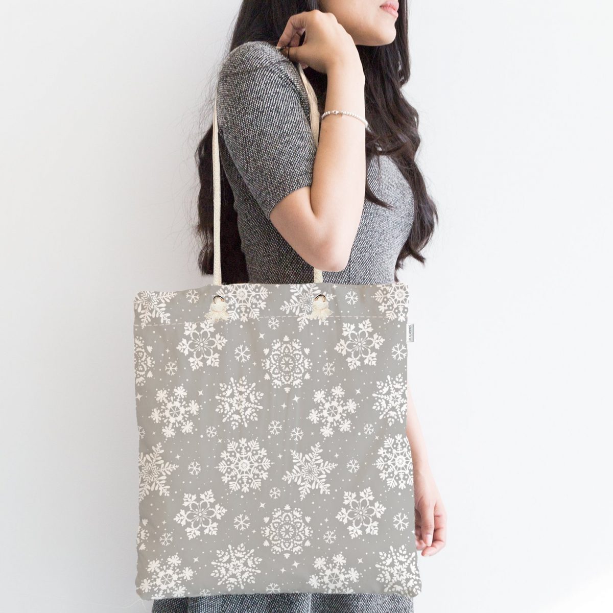 Gri Zeminli Kar Taneleri Temalı Modern Tasarım Fermuarlı Modern Kumaş Çanta