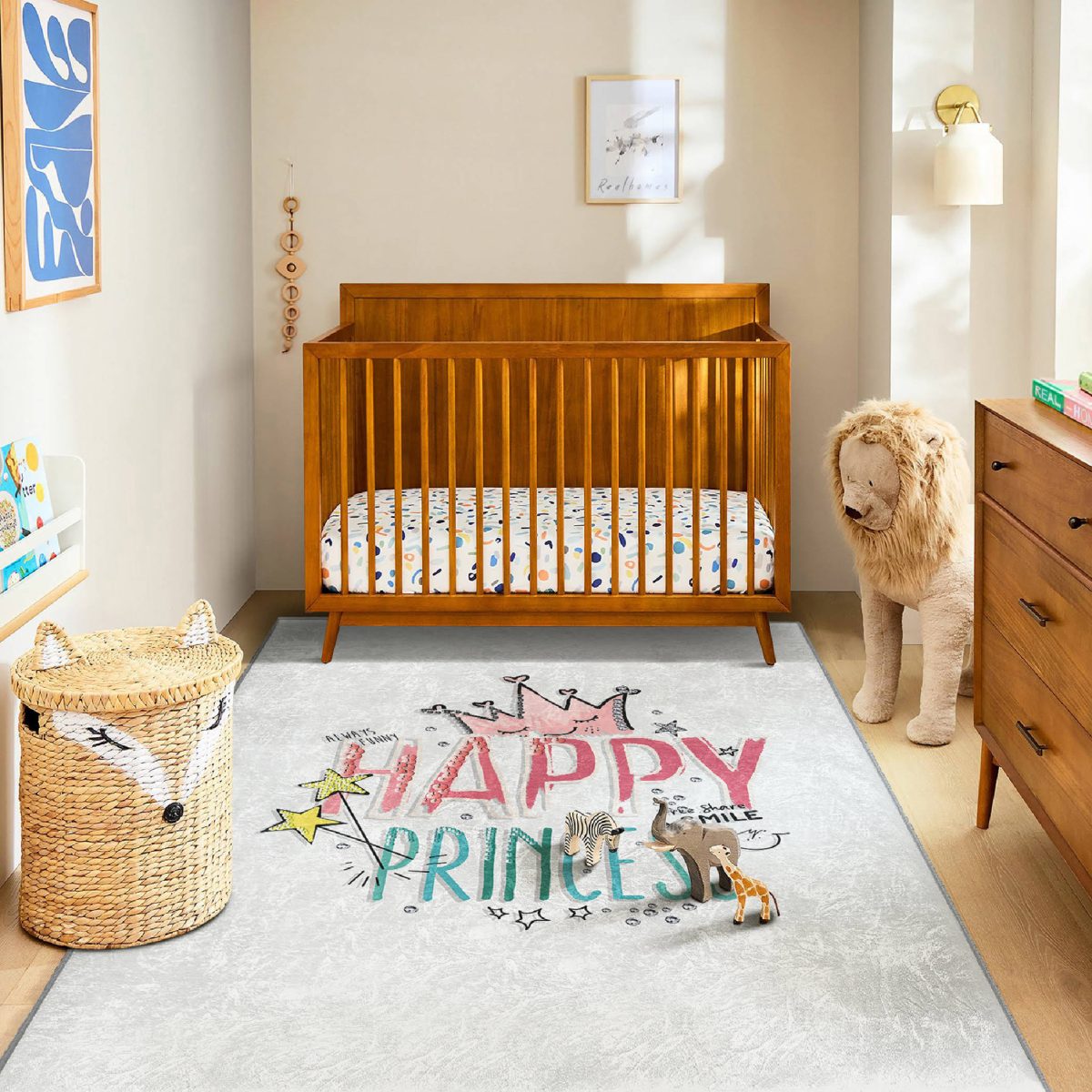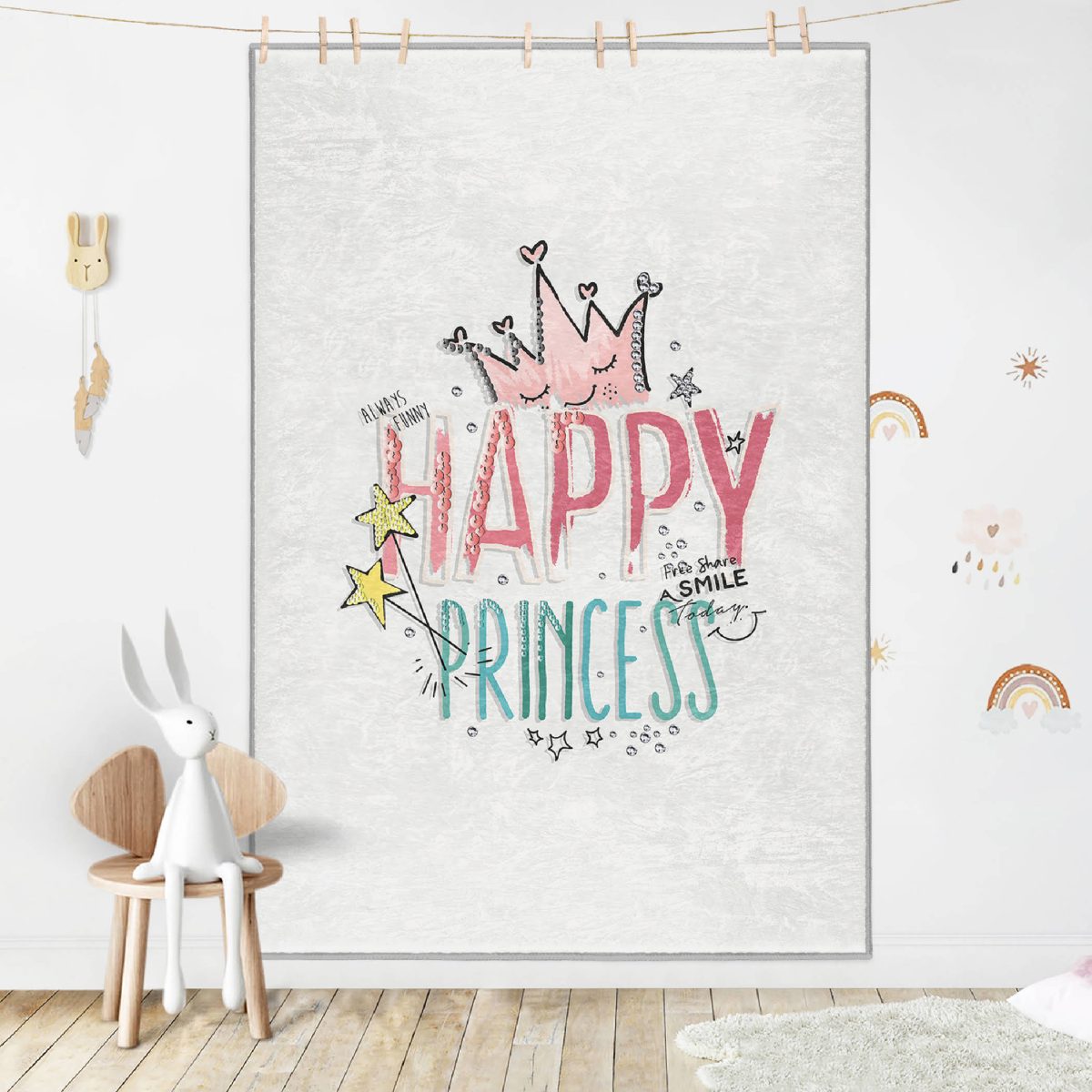 Happy Princess Yazı Desenli Çocuk & Genç Odası Makinede Yıkanabilir Kaymaz Tabanlı Özel Ölçü Dikdörtgen Pamuk Tabanlı Çocuk Halısı