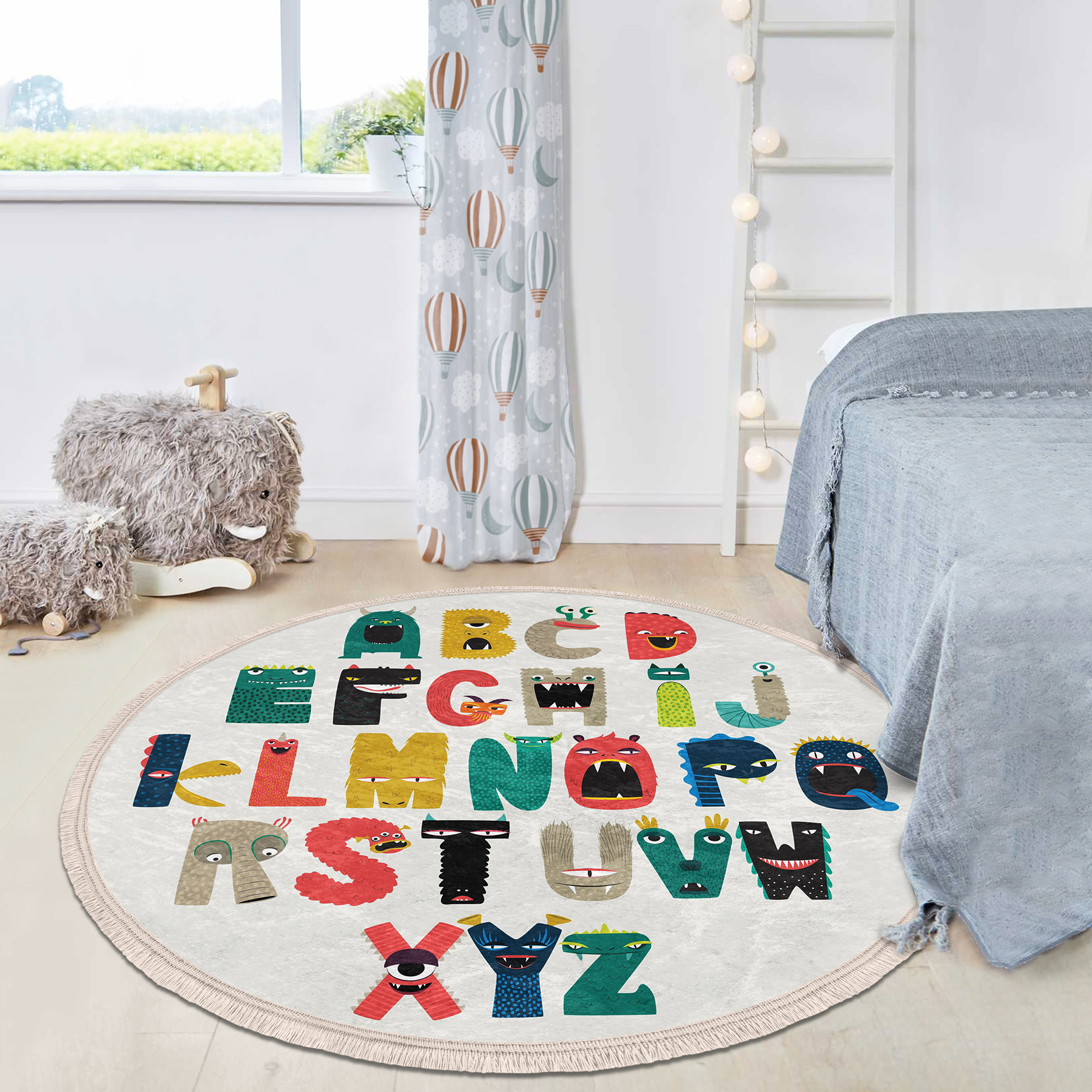 Hayvan Tasarımlı Öğretici Harf Tasarımlı Çocuk & Genç Odası Makinede Yıkanabilir Kaymaz Tabanlı Püsküllü Yuvarlak Çocuk Oyun Halısı