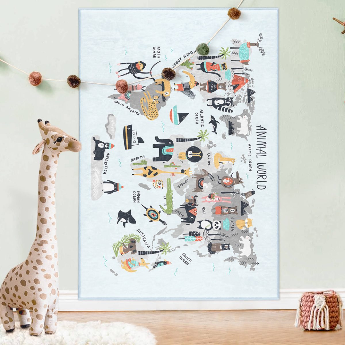 Hayvanların Dünyası Eğitici Tasarımlı Çocuk & Genç Odası Makinede Yıkanabilir Kaymaz Tabanlı Özel Ölçü Dikdörtgen Çocuk Oyun Halısı
