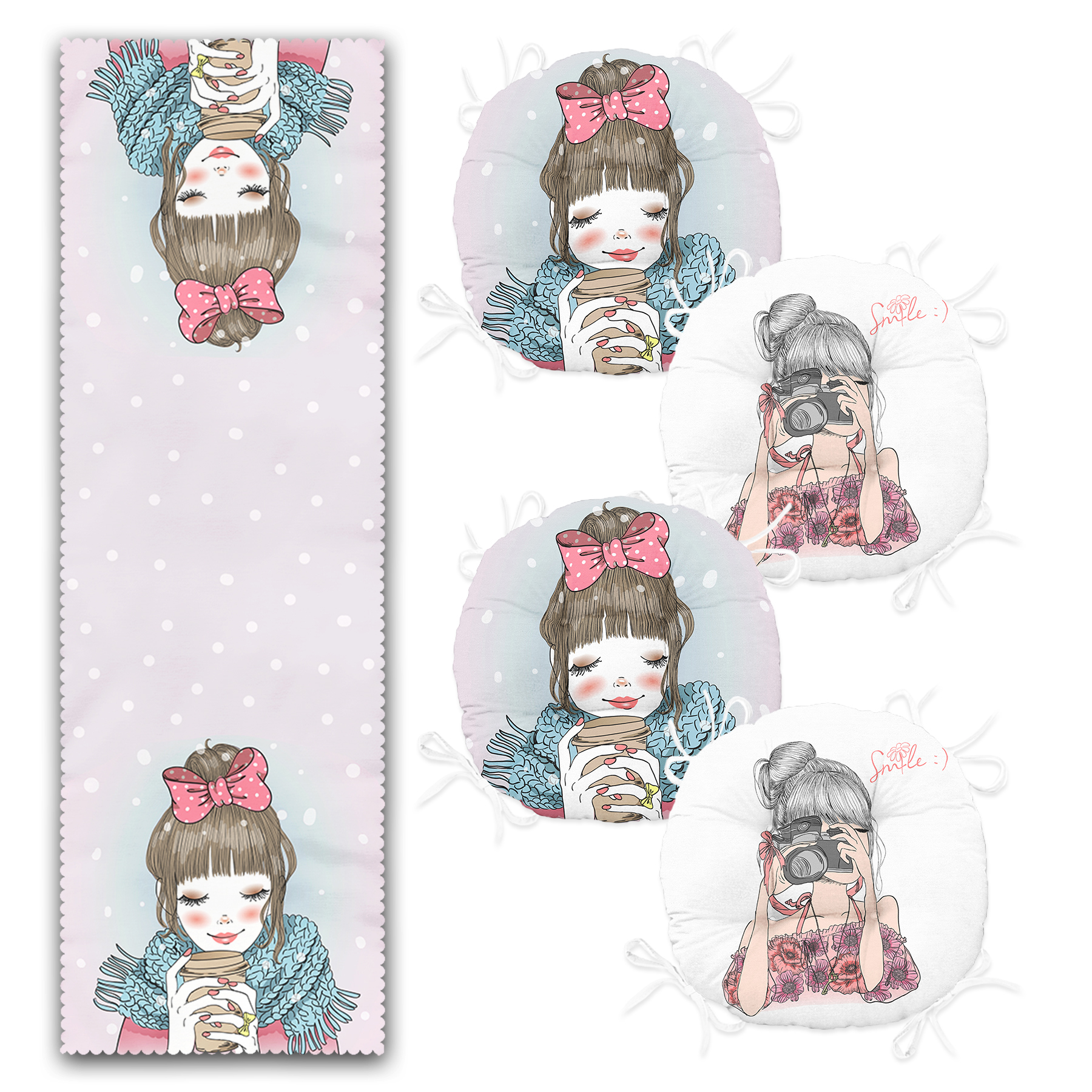 Kahve İçen Kız & Fotoğraf Çeken Kız Tasarımlı 4 Yuvarlak Pofuduk Sandalye Minderi ve 1 Runner Seti